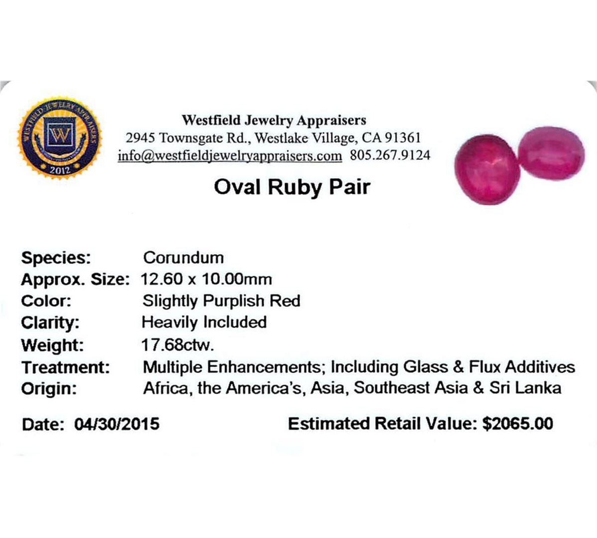 Two oval mixed cut natural rubies, measuring 12.60 x 10.00 x 5.80mm, exact total weight 17.68ct., clarity is heavily included, type II, dark, slightly brownish, slightly purplish red color, (GIA slpR 7/2), cut is good. Transmitting light somewhat diffusely, translucent. Naturally occurring internal & external characteristics are present. Indications of laboratory high temperature heat treatment, with glass & flux additives. Ruby has a low tolerance to rhodium plating, repolishing the surface, & ultrasonic cleaning. Westfield Appraised at $2,065.00.