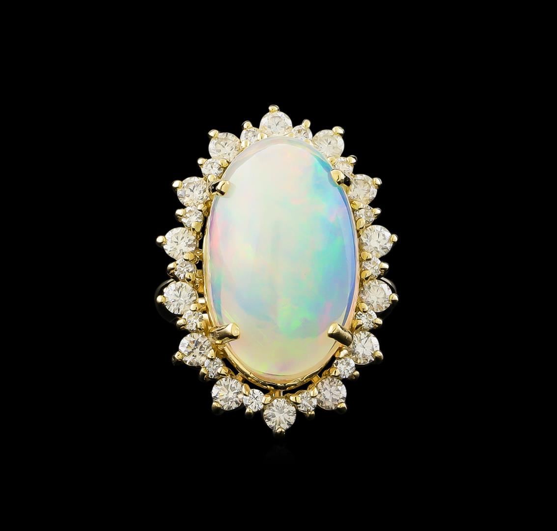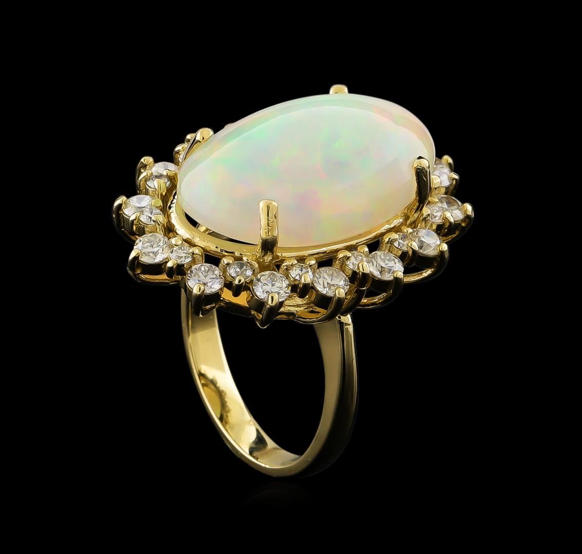 One electronically tested 14KT yellow gold lady's cast fashion ring with a basket halo with a bright polish finish. The featured lady's ring has a shank measuring 2.94 millimeters in width. Identified with markings of "K14". Condition is new, good workmanship. Containing: One crystal opal that is cut in a oval shaped cabochon and is prong set, measuring 20.85 mm long x 12.95 mm wide, and 10.51 mm thick and the approximate weight is 17.70 carats. The opal has a somewhat bright, multicolor play of color (fire) in a flashfire pattern; a medium dome; a good cut; slightly included; slight variation in base in its brightness and pattern; and is slightly directional. Transmitting light somewhat diffusely, semi-transparent to translucent. Graded in the setting. Fourteen prong set round brilliant cut diamonds, measuring 2.90 - 2.80 x 1.77mm (depth est.) approximate total weight of 14 Stones = 1.22ct. Graded in the setting. Clarity: VS-2 to SI-1. Color: H - I. Cut Very Good Fourteen prong set round brilliant cut diamonds, measuring 1.90 - 1.80 x 1.15mm (depth est.) approximate total weight of 14 Stones = 0.33ct. Graded in the setting. Clarity: SI-1 to SI-2. Color: G - Good. Total Weight of Diamonds 1.55ct. Total Weight of Opals 17.70ct. Total Weight of Ring 10.10gm. GAS Appraised at $7,345.00.