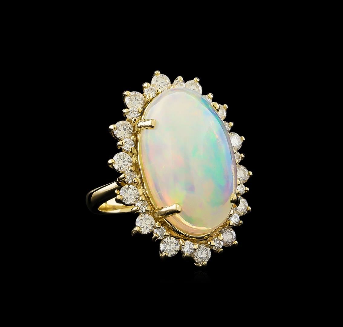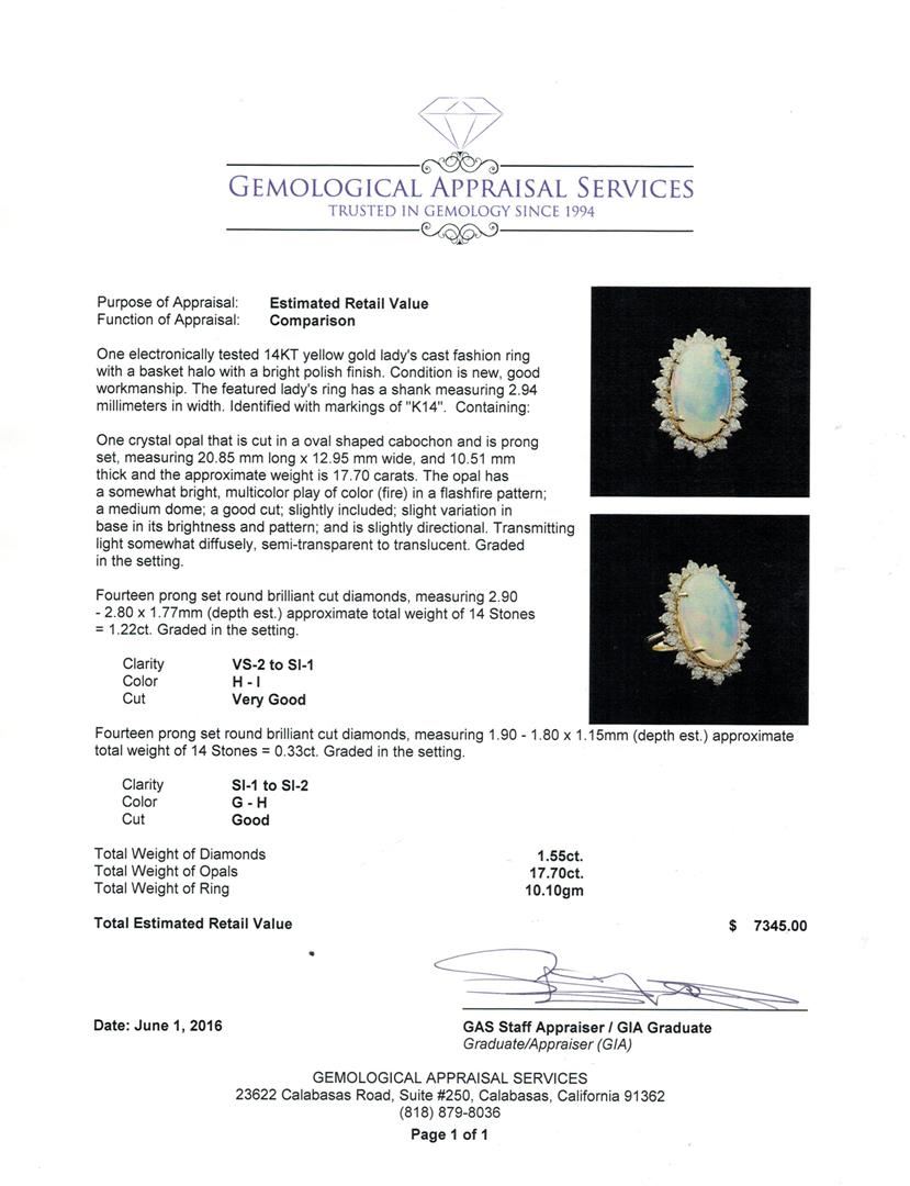 One electronically tested 14KT yellow gold lady's cast fashion ring with a basket halo with a bright polish finish. The featured lady's ring has a shank measuring 2.94 millimeters in width. Identified with markings of "K14". Condition is new, good workmanship. Containing: One crystal opal that is cut in a oval shaped cabochon and is prong set, measuring 20.85 mm long x 12.95 mm wide, and 10.51 mm thick and the approximate weight is 17.70 carats. The opal has a somewhat bright, multicolor play of color (fire) in a flashfire pattern; a medium dome; a good cut; slightly included; slight variation in base in its brightness and pattern; and is slightly directional. Transmitting light somewhat diffusely, semi-transparent to translucent. Graded in the setting. Fourteen prong set round brilliant cut diamonds, measuring 2.90 - 2.80 x 1.77mm (depth est.) approximate total weight of 14 Stones = 1.22ct. Graded in the setting. Clarity: VS-2 to SI-1. Color: H - I. Cut Very Good Fourteen prong set round brilliant cut diamonds, measuring 1.90 - 1.80 x 1.15mm (depth est.) approximate total weight of 14 Stones = 0.33ct. Graded in the setting. Clarity: SI-1 to SI-2. Color: G - Good. Total Weight of Diamonds 1.55ct. Total Weight of Opals 17.70ct. Total Weight of Ring 10.10gm. GAS Appraised at $7,345.00.