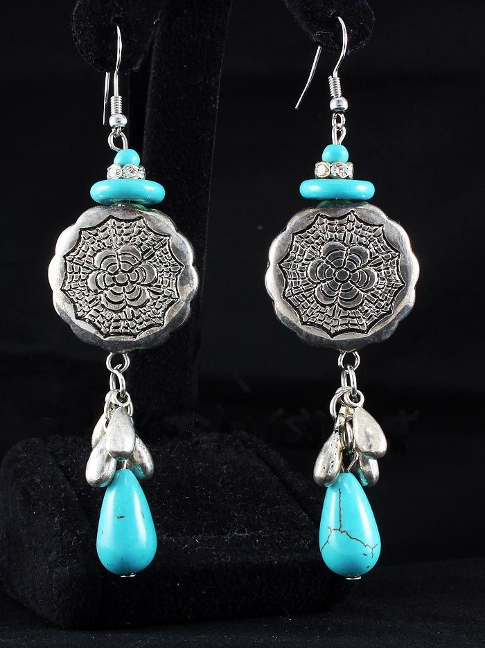 17.74GRAMS ANTIQUE LOOKS TURQUOISE SILVER EARRING **|**|** 3.50 INCHES LONG DESIGN ANTIQUE TURQUOISE SILVER HOOK EARRING ; MSRP: $100