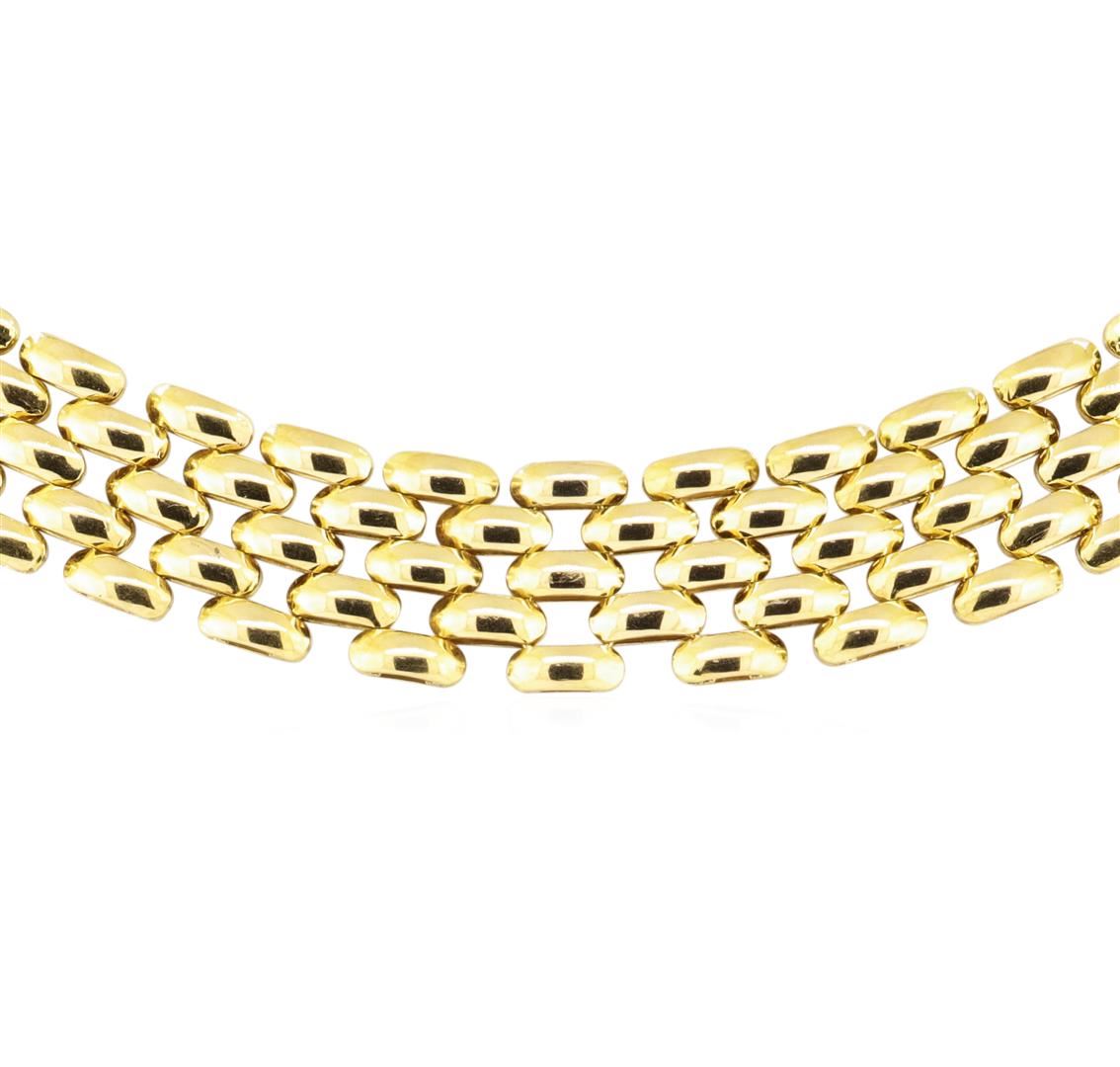 One 13.5mm wide five row panther link chain measuring approximately 17.75 inches in length featuring: 18KT yellow gold weighing 58.6 grams.