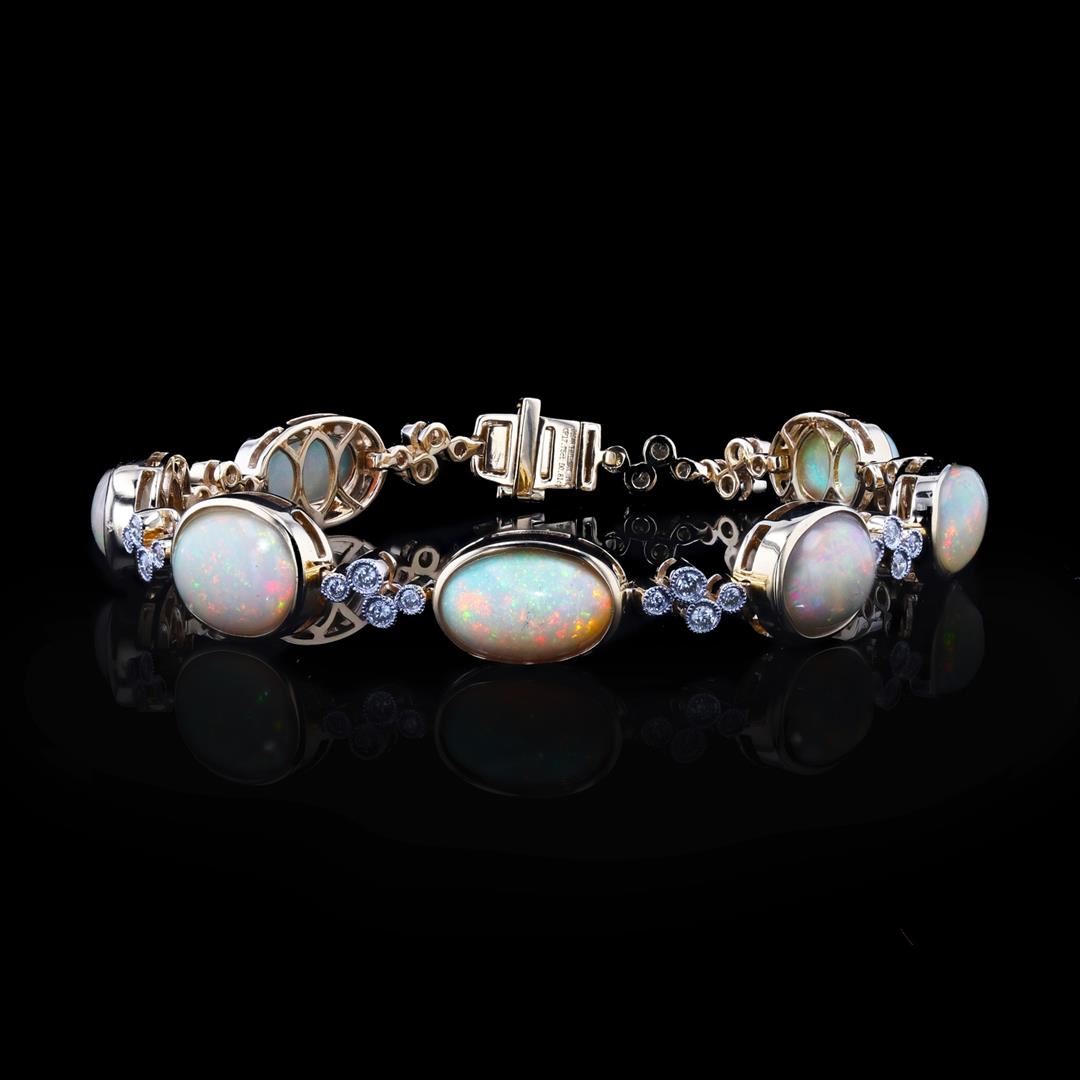 17.75ctw Opal and 0.81ctw Diamond 14K Yellow Gold Bracelet. Please see Photos and Description for all available information. This opal and diamond 14K yellow gold bracelet is a sophisticated and fashionable piece. The bracelet features 40 round brilliant cut diamonds and 7 natural opals. The diamonds weigh 0.81ct and the opal weighs 17.75ct.