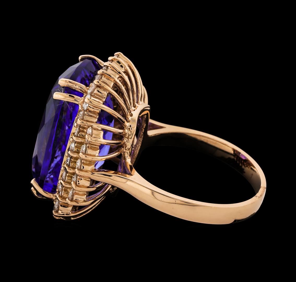 One electronically tested 14KT rose gold lady's cast fashion ring with a cathedral shank with a basket halo with a bright polish finish. The featured lady's ring has an additional row of diamonds flanking each shoulder and a shank measuring 2.65 millimeters wide. Identified with markings of 'K14'. Condition is new, good workmanship. Containing: One prong set rectangular cushion modified brilliant cut natural tanzanite, measuring 18.67 x 12.70 x 8.90mm, (depth est.) 7%. bulge factor, approximate weight of 17.77ct., clarity is eye clean, medium dark, moderately strong, violetish blue color, (GIA vB 6/4), cut is very good. Transmitting light with no distortion, transparent. Colored gemstones are presumed to have been subjected to commonly used enhancement processes. Graded in the setting. Thirty-Six prong set round brilliant cut diamonds, measuring 2.25 - 2.15 x 1.34mm (depth est.) approximate total weight of 36 Stones = 1.42ct. Graded in the setting. Clarity SI-1 to I-1. Color: G - I Cut Good. Total Weight of Colored Stones 17.77ct.. Total Weight of Diamonds 1.42ct.. Total Weight of Ring 11.00gm. GAS Appraised at $26,455.00.