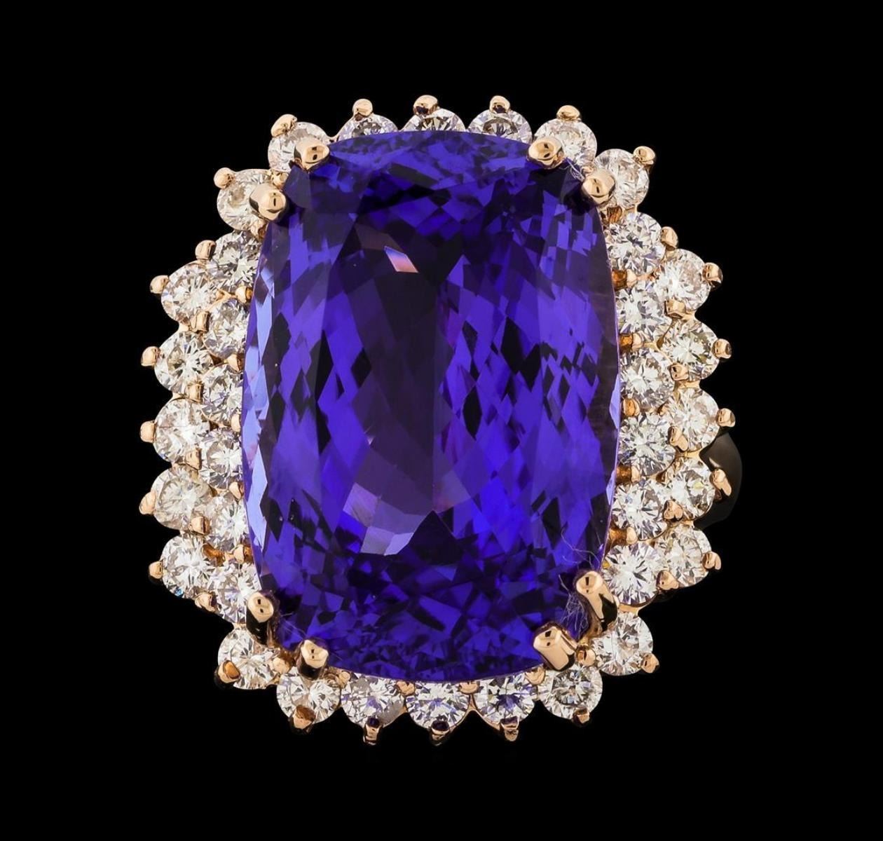 One electronically tested 14KT rose gold lady's cast fashion ring with a cathedral shank with a basket halo with a bright polish finish. The featured lady's ring has an additional row of diamonds flanking each shoulder and a shank measuring 2.65 millimeters wide. Identified with markings of 'K14'. Condition is new, good workmanship. Containing: One prong set rectangular cushion modified brilliant cut natural tanzanite, measuring 18.67 x 12.70 x 8.90mm, (depth est.) 7%. bulge factor, approximate weight of 17.77ct., clarity is eye clean, medium dark, moderately strong, violetish blue color, (GIA vB 6/4), cut is very good. Transmitting light with no distortion, transparent. Colored gemstones are presumed to have been subjected to commonly used enhancement processes. Graded in the setting. Thirty-Six prong set round brilliant cut diamonds, measuring 2.25 - 2.15 x 1.34mm (depth est.) approximate total weight of 36 Stones = 1.42ct. Graded in the setting. Clarity SI-1 to I-1. Color: G - I Cut Good. Total Weight of Colored Stones 17.77ct.. Total Weight of Diamonds 1.42ct.. Total Weight of Ring 11.00gm. GAS Appraised.