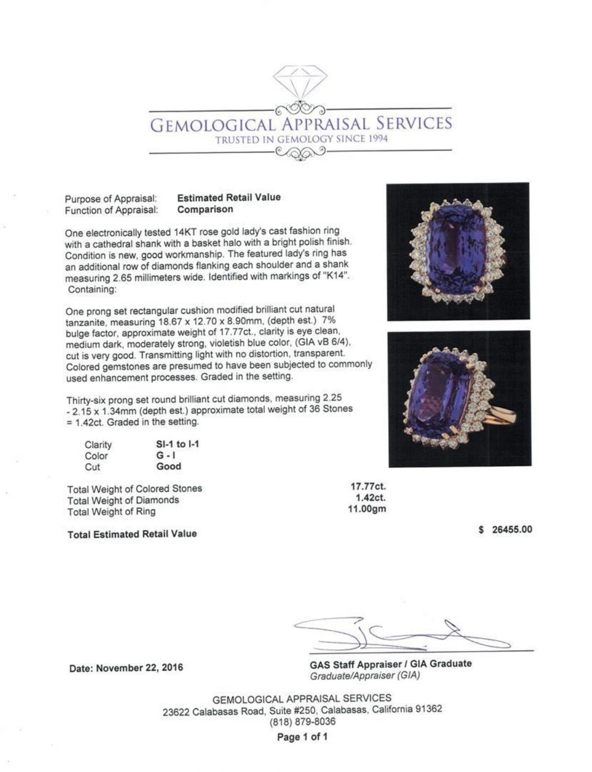 One electronically tested 14KT rose gold lady's cast fashion ring with a cathedral shank with a basket halo with a bright polish finish. The featured lady's ring has an additional row of diamonds flanking each shoulder and a shank measuring 2.65 millimeters wide. Identified with markings of 'K14'. Condition is new, good workmanship. Containing: One prong set rectangular cushion modified brilliant cut natural tanzanite, measuring 18.67 x 12.70 x 8.90mm, (depth est.) 7%. bulge factor, approximate weight of 17.77ct., clarity is eye clean, medium dark, moderately strong, violetish blue color, (GIA vB 6/4), cut is very good. Transmitting light with no distortion, transparent. Colored gemstones are presumed to have been subjected to commonly used enhancement processes. Graded in the setting. Thirty-Six prong set round brilliant cut diamonds, measuring 2.25 - 2.15 x 1.34mm (depth est.) approximate total weight of 36 Stones = 1.42ct. Graded in the setting. Clarity SI-1 to I-1. Color: G - I Cut Good. Total Weight of Colored Stones 17.77ct.. Total Weight of Diamonds 1.42ct.. Total Weight of Ring 11.00gm. GAS Appraised.