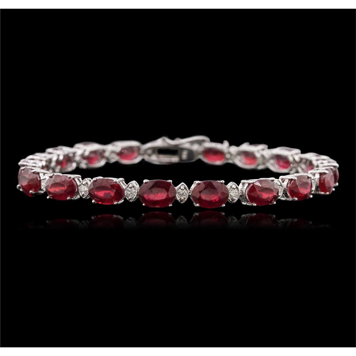One electronically tested 14KT white gold ladies cast & assembled ruby and diamond bracelet with a bright polish finish. Condition is good. Seven and one-quarter inch length bracelet features a flexible ruby and diamond ribbon, terminating in a concealed clasp with safety. Identified with markings of "14K". Containing: Nineteen prong set oval mixed cut natural rubies, measuring 6.80 x 4.80 x 3.20mm, 8% bulge factor, approximate total weight of 17.77ct., clarity is heavily included, type II, dark, very slightly brownish, slightly purplish red color, (GIA slpR 7/3), cut is good. Transmitting light somewhat diffusely, transparent to translucent. Naturally occurring internal & external characteristics are present. Indications of laboratory high temperature heat treatment, with glass & flux additives. Measurements & the color grade are an average for the group. Graded in the setting. Ruby has a low tolerance to rhodium plating, repolishing the surface, & ultrasonic cleaning. Nineteen bead set round brilliant cut diamonds, measuring 2.10 - 2.00 x 1.23mm (depth est.) approximate total weight of 19 Stones = 0.70ct. Graded in the setting. Clarity: SI-1 to I-1. Color: G-I. Total Weight of Colored Stones: 17.77ct. Total Weight of Diamonds: 0.70ct. Total Weight of Bracelet: 12.02 gm. AIG Appraised at $5,430.00.