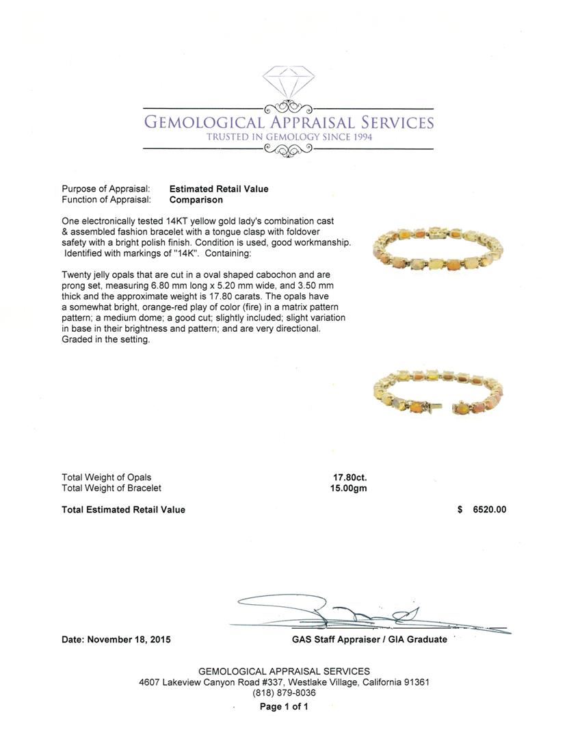 One electronically tested 14KT yellow gold lady's combination cast & assembled fashion bracelet with a tongue clasp with foldover safety with a bright polish finish. Identified with markings of "14K". Condition is used, good workmanship. Containing: Twenty jelly opals that are cut in a oval shaped cabochon and are prong set, measuring 6.80 mm long x 5.20 mm wide, and 3.50 mm thick and the approximate weight is 17.80 carats. The opals have a somewhat bright, orange-red play of color (fire) in a matrix pattern pattern; a medium dome; a good cut; slightly included; slight variation in base in their brightness and pattern; and are very directional. Graded in the setting. Total Weight of Opals 17.80ct. Total Weight of Bracelet 15.00gm. GAS Appraised.