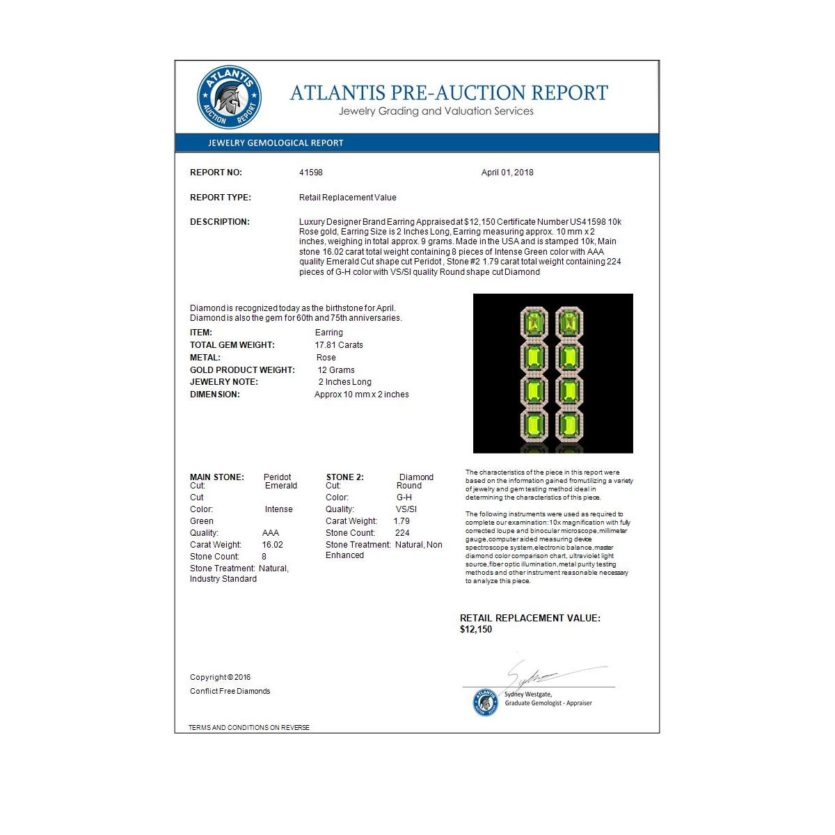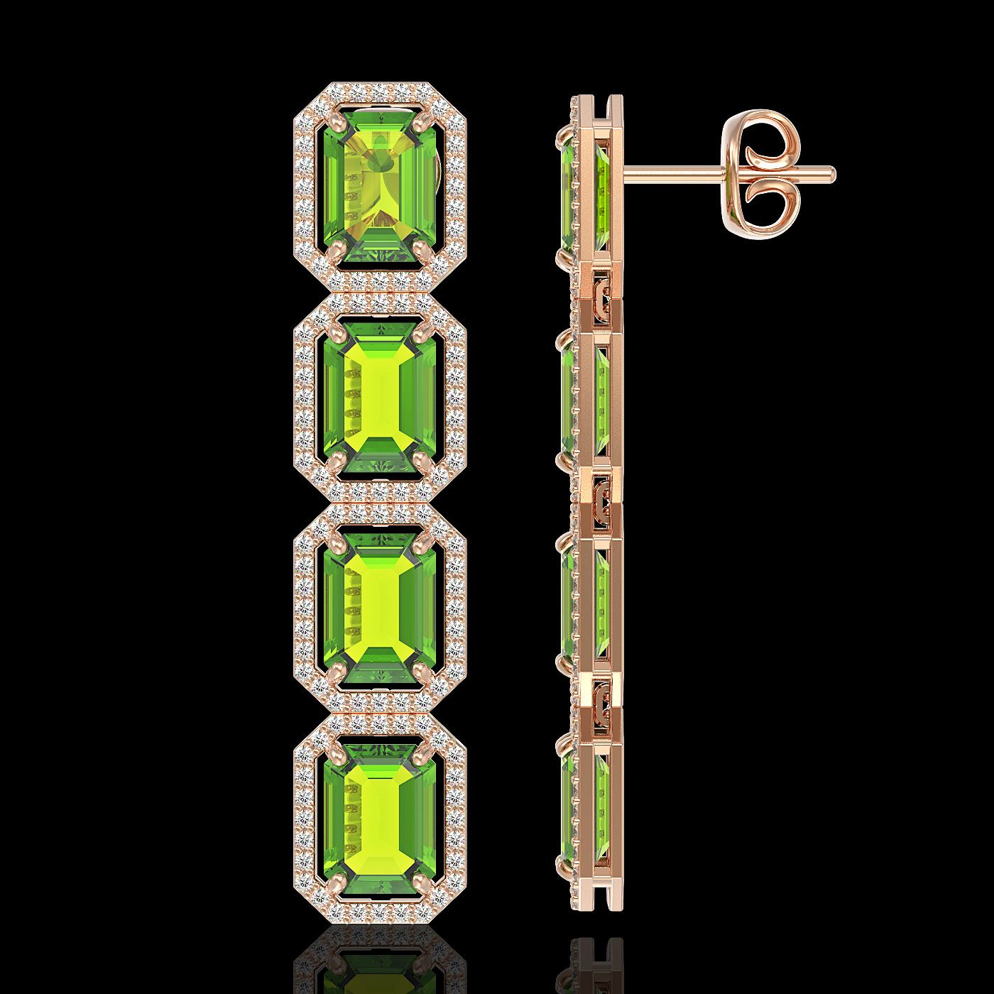 REF-220W8F -41598 ---- 17.81 CTW Peridot & Diamond Halo Earrings 10K Rose Gold ---- Luxury Designer Brand Earring Appraised at $12,150 Certificate Number US41598  10k Rose gold,  Earring Size is 2 Inches Long, Earring measuring approx. 10 mm x 2 inches, weighing in total approx. 9 grams. Made in the USA and is stamped 10k, Main stone 16.02 carat total weight containing 8 pieces of Intense Green color with AAA quality Emerald Cut shape cut Peridot , Stone #2 1.79 carat total weight containing 224 pieces of G-H color with  VS/SI quality Round shape cut Diamond