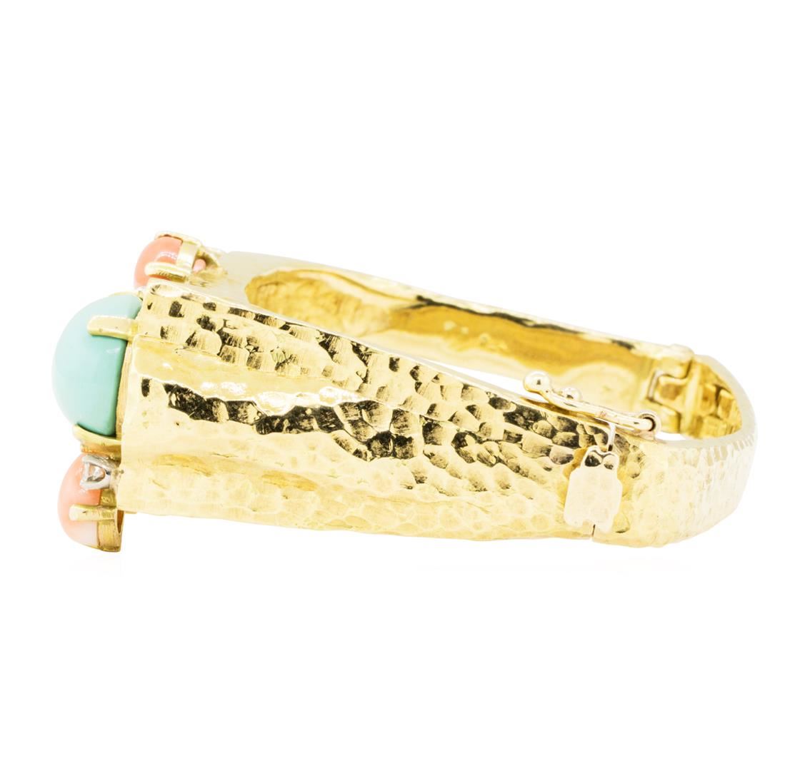 One electronically tested 18KT yellow gold lady's combination cast & assembled fashion square bangle bracelet with a tongue clasp & foldover safety with a hammered motif with a bright polish and satin finish. The featured lady's square bangle bracelet has a free-form artistic style. Identified with markings of '18K'. Condition is like new, good workmanship. Containing: One prong set oval cabochon standard cut natural turquoise, measuring 14.50 x 12.40 x 6.50mm, (depth est.) approximate weight of 8.40ct., medium, strong, very slightly greenish blue color, (GIA vslgB 5/5), cut is very good. Colored gemstones are presumed to have been subjected to commonly used enhancement processes. Graded in the setting. Six prong set pear cabochon standard cut natural pink corals, measuring 9.00 x 6.40 x 4.16mm, (depth est.) approximate total weight of 9.00ct., medium dark, moderately strong, orangy red color, (GIA oR 6/4), cut is very good. Colored gemstones are presumed to have been subjected to commonly used enhancement processes. Graded in the setting. Eight prong set round brilliant cut diamonds, measuring 2.50 - 2.30 x 1.49mm (depth est.) approximate total weight of 8 Stones = 0.42ct. Graded in the setting. Color G - H Clarity SI-1 to SI-2 Cut Good. Total Weight of Colored Stones 17.40ct.. Total Weight of Diamonds 0.42ct.. Total Weight of Bangle Bracelet 67.00gm GAS Appraised at $9700.00. GAS Appraised.