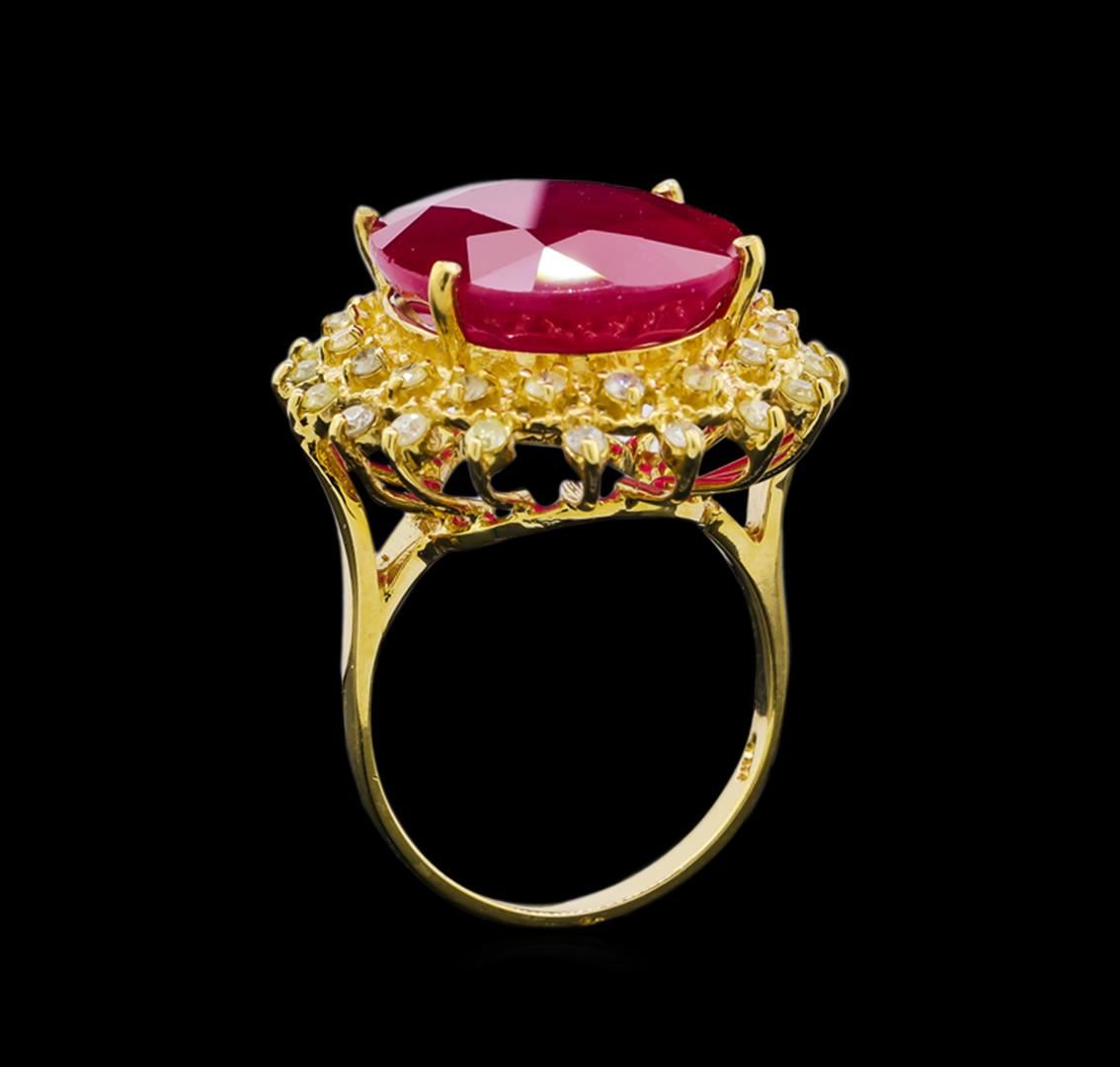 One electronically tested 14KT yellow gold ladies cast ruby and diamond ring with a bright polish with milgrain finish. The featured ruby is set within a floral diamond bezel, completed by a two millimeter wide band. Identified with markings of "K14". Condition is new, good workmanship. Containing: One prong set oval mixed cut natural ruby, measuring 19.60 x 14.75 x 8.85mm, approximate weight of 17.87ct., clarity is heavily included, type II, medium dark, moderately strong, slightly purplish red color, (GIA slpR 6/4), cut is good. Transmitting light somewhat diffusely, transparent to translucent. Naturally occurring internal & external characteristics are present. Indications of laboratory high temperature heat treatment, with glass & flux additives. Graded in the setting. Ruby has a low tolerance to rhodium plating, repolishing the surface, & ultrasonic cleaning. Thirty-Six prong set round brilliant cut diamonds, measuring 1.80 - 1.70 x 1.05mm (depth est.) approximate total weight of 36 Stones = 0.75ct. Graded in the setting. Clarity: I-2 to I-3. Color: J - L. Total Weight of Colored Stones 17.87ct. Total Weight of Diamonds 0.75ct. Total Weight of Ring 10.00gm. AIG Appraised at $7,075.00.