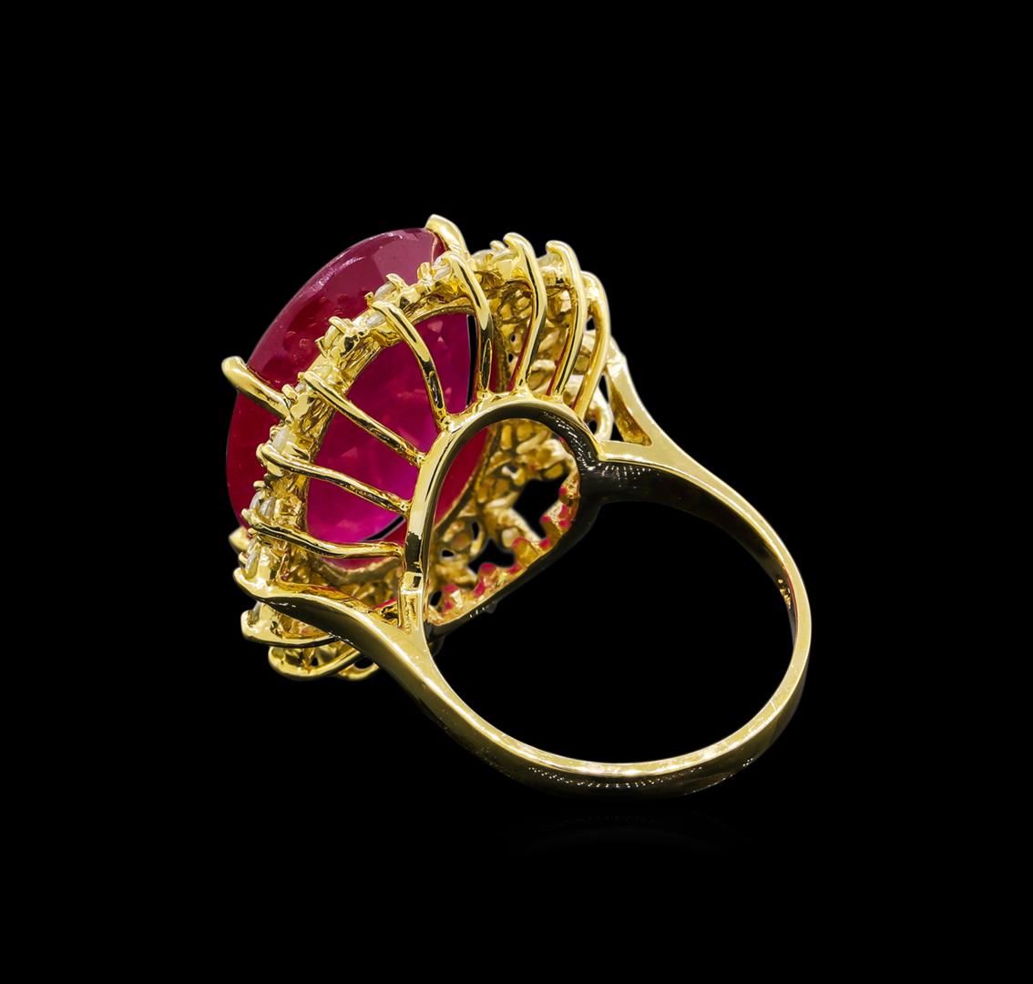 One electronically tested 14KT yellow gold ladies cast ruby and diamond ring with a bright polish with milgrain finish. The featured ruby is set within a floral diamond bezel, completed by a two millimeter wide band. Identified with markings of "K14". Condition is new, good workmanship. Containing: One prong set oval mixed cut natural ruby, measuring 19.60 x 14.75 x 8.85mm, approximate weight of 17.87ct., clarity is heavily included, type II, medium dark, moderately strong, slightly purplish red color, (GIA slpR 6/4), cut is good. Transmitting light somewhat diffusely, transparent to translucent. Naturally occurring internal & external characteristics are present. Indications of laboratory high temperature heat treatment, with glass & flux additives. Graded in the setting. Ruby has a low tolerance to rhodium plating, repolishing the surface, & ultrasonic cleaning. Thirty-Six prong set round brilliant cut diamonds, measuring 1.80 - 1.70 x 1.05mm (depth est.) approximate total weight of 36 Stones = 0.75ct. Graded in the setting. Clarity: I-2 to I-3. Color: J - L. Total Weight of Colored Stones 17.87ct. Total Weight of Diamonds 0.75ct. Total Weight of Ring 10.00gm. AIG Appraised at $7,075.00.