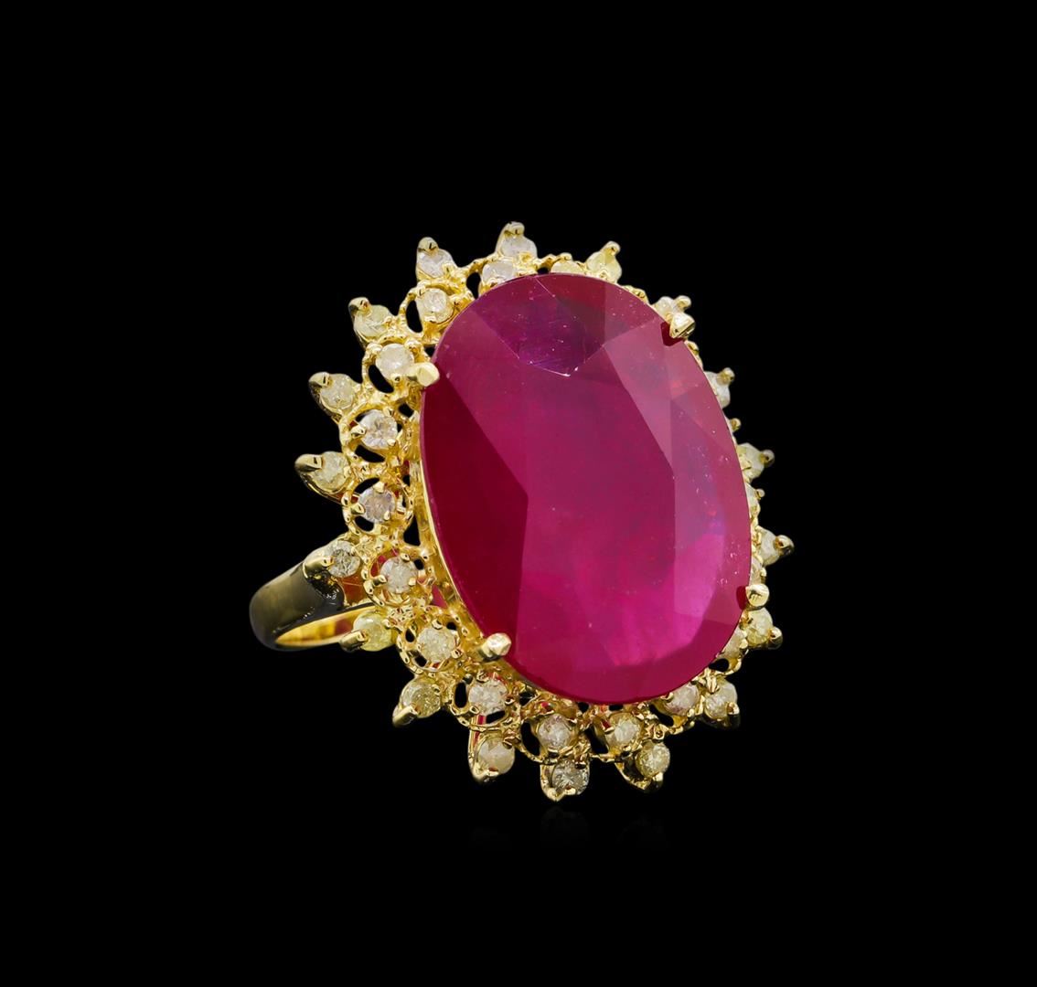 One electronically tested 14KT yellow gold ladies cast ruby and diamond ring with a bright polish with milgrain finish. The featured ruby is set within a floral diamond bezel, completed by a two millimeter wide band. Identified with markings of "K14". Condition is new, good workmanship. Containing: One prong set oval mixed cut natural ruby, measuring 19.60 x 14.75 x 8.85mm, approximate weight of 17.87ct., clarity is heavily included, type II, medium dark, moderately strong, slightly purplish red color, (GIA slpR 6/4), cut is good. Transmitting light somewhat diffusely, transparent to translucent. Naturally occurring internal & external characteristics are present. Indications of laboratory high temperature heat treatment, with glass & flux additives. Graded in the setting. Ruby has a low tolerance to rhodium plating, repolishing the surface, & ultrasonic cleaning. Thirty-Six prong set round brilliant cut diamonds, measuring 1.80 - 1.70 x 1.05mm (depth est.) approximate total weight of 36 Stones = 0.75ct. Graded in the setting. Clarity: I-2 to I-3. Color: J - L. Total Weight of Colored Stones 17.87ct. Total Weight of Diamonds 0.75ct. Total Weight of Ring 10.00gm. AIG Appraised at $7,075.00.