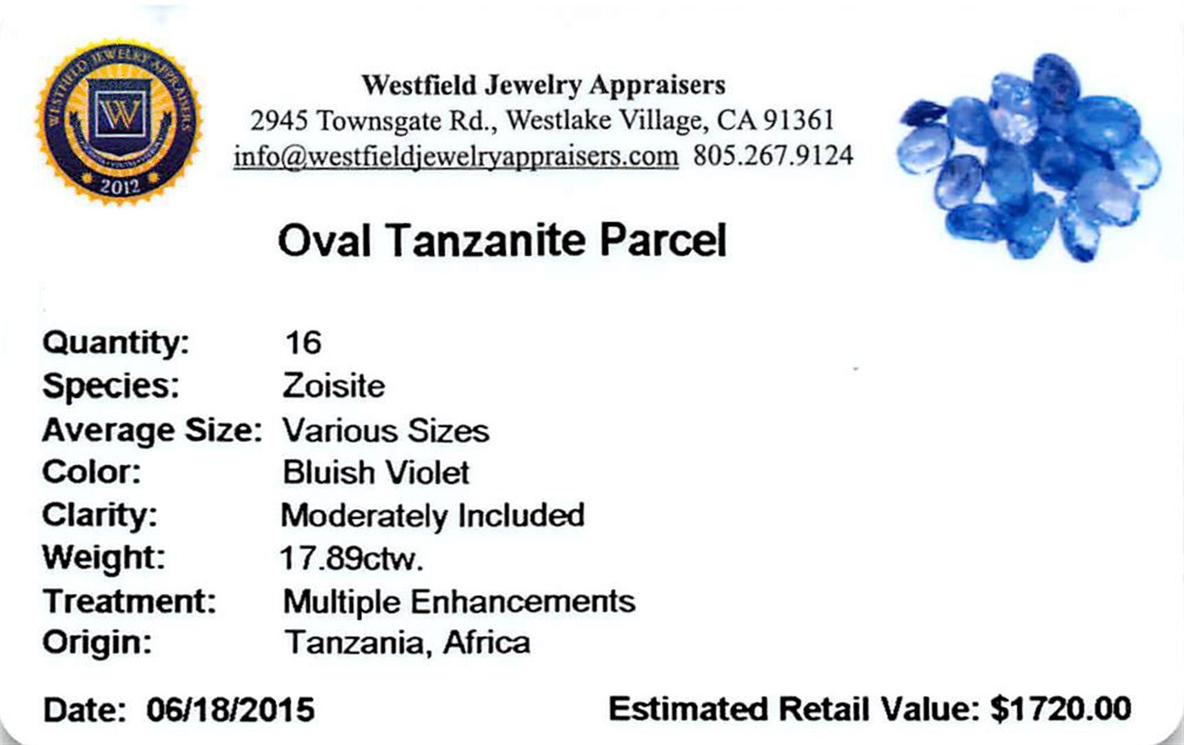 Sixteen oval mixed cut natural tanzanites exact total weight 17.89ct., clarity is moderately included, type I, medium dark, very slightly grayish, bluish violet color, (GIA bV 6/3), cut is good. Transmitting light with a minimum of distortion, transparent. Naturally occurring internal & external characteristics are present. Color grade is an average for the group. Tanzanite is a very rare gemstone that is only found in the country of Tanzania. Originally discovered in 1967. Tiffany & Company, named the stone Tanzanite. It is found in the Usumburu Mountains that border the Umba Valley of northern Tanzania. Tanzanite occurs in gray, brown, violet, blue, reddish-purple, & green. The gem is interesting because of its exceptional pleochroism. Rotated in different directions a tanzanite will exhibit multiple changes of color. Tanzanite has a low tolerance to ultrasonic cleaning, and should not be cleaned using this method. Westfield Appraised at $1,720.00.