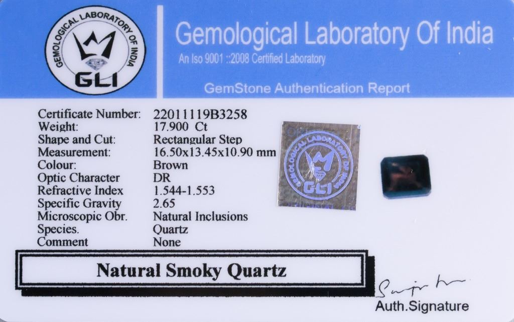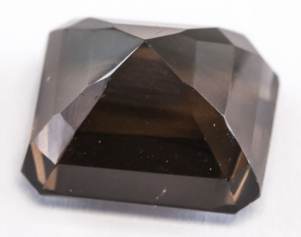 17.90 ct rectangular step brown natural smoky quartz. Accompanied with GLI certificate. 16.50 x 13.45 x 10.90 mm.