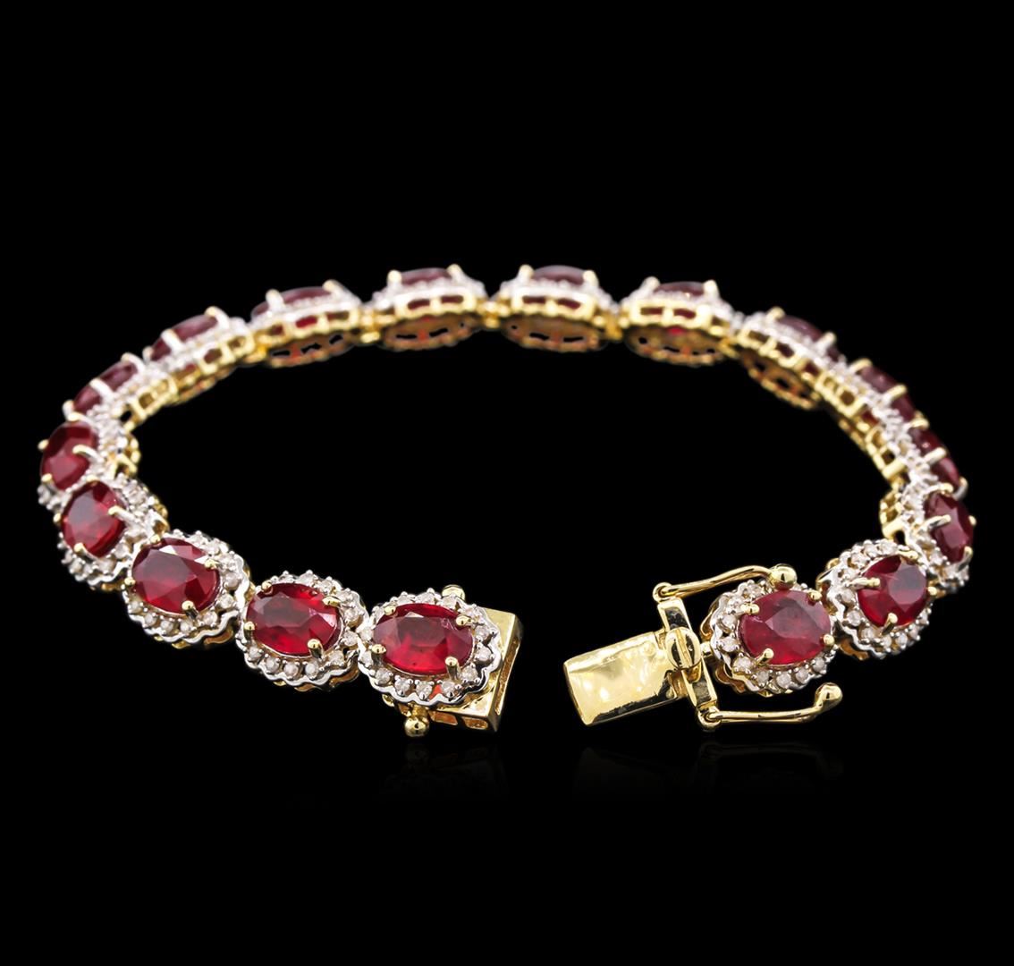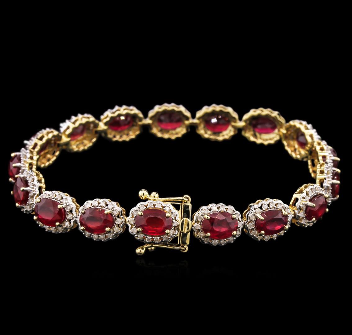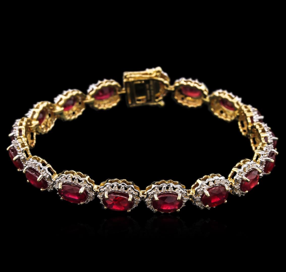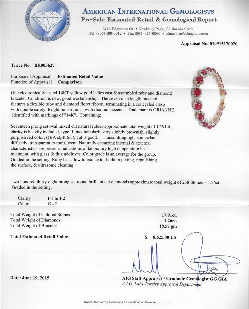 One electronically tested 14KT yellow gold ladies cast & assembled ruby and diamond bracelet. Condition is new, good workmanship. The seven inch length bracelet features a flexible ruby and diamond floret ribbon, terminating in a concealed clasp with double safety. Bright polish finish with rhodium accents. Trademark is ORIANNE. Identifies with markings of "14K". Containing: Seventeen prong set oval mixed cut natural rubies approximate total weight of 17.91ct., clarity is heavily included, type II, medium dark, very slightly brownish, slightly purplish red color, (GIA s1pR 6/3), cut is good. Transmitting light somewhat diffusely, transparent to translucent. Naturally occurring internal & external characteristics are present. Indications of laboratory high temperature heat treatment, with glass & flux additives. Color grade is an average for the group. Graded in the setting. Ruby has a low tolerance to rhodium plating, repolishing the surface, & ultrasonic cleaning. Two hundred thirty-eight prong set round brilliant cut diamonds approximate total weight of 238 Stone = 1.26ct. Graded in the setting. Clarity: I-1 to I-2. Color: G - I. Total Weight of Colored Stones: 17. 91ct. Total Weight of Diamonds: 1.26ct. Total Weight of Bracelet: 18.57gm. AIG Appraised at $8,625.00.