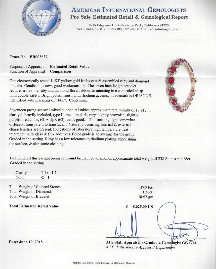 One electronically tested 14KT yellow gold ladies cast & assembled ruby and diamond bracelet. Condition is new, good workmanship. The seven inch length bracelet features a flexible ruby and diamond floret ribbon, terminating in a concealed clasp with double safety. Bright polish finish with rhodium accents. Trademark is ORIANNE. Identifies with markings of "14K". Containing: Seventeen prong set oval mixed cut natural rubies approximate total weight of 17.91ct., clarity is heavily included, type II, medium dark, very slightly brownish, slightly purplish red color, (GIA s1pR 6/3), cut is good. Transmitting light somewhat diffusely, transparent to translucent. Naturally occurring internal & external characteristics are present. Indications of laboratory high temperature heat treatment, with glass & flux additives. Color grade is an average for the group. Graded in the setting. Ruby has a low tolerance to rhodium plating, repolishing the surface, & ultrasonic cleaning. Two hundred thirty-eight prong set round brilliant cut diamonds approximate total weight of 238 Stone = 1.26ct. Graded in the setting. Clarity: I-1 to I-2. Color: G - I. Total Weight of Colored Stones: 17. 91ct. Total Weight of Diamonds: 1.26ct. Total Weight of Bracelet: 18.57gm. AIG Appraised at $8,625.00.