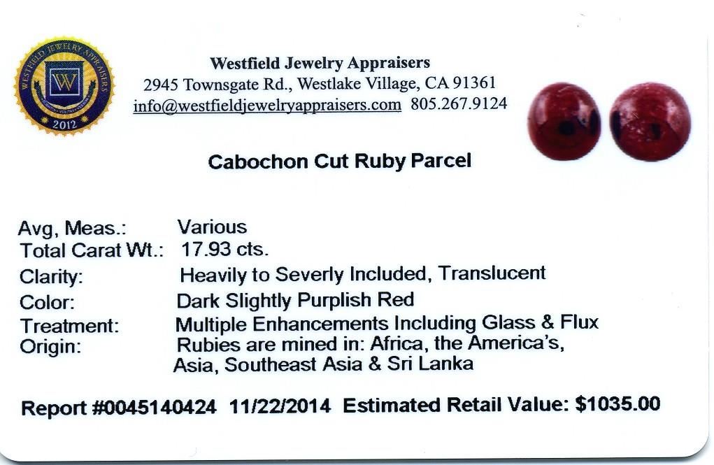 17.93ctw. Cabochon Cut Ruby Parcel. Westfield Appraised at $1,035.00.