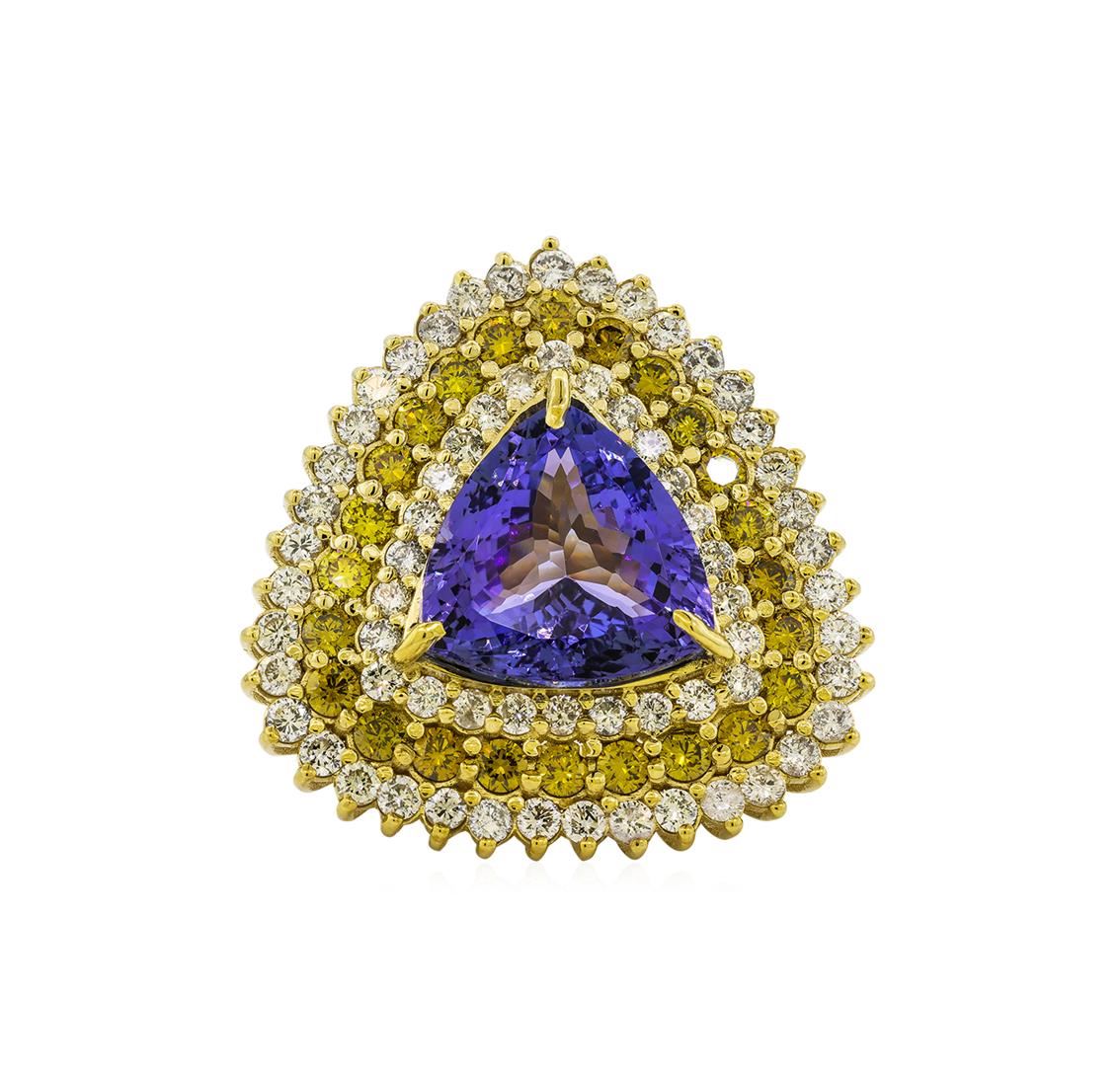 One electronically tested 14KT yellow gold ladies cast tanzanite and diamond ring. The featured tanzanite is set within a yellow and white diamond ribbon frame supported by a ribbed under gallery, completed by a three millimeter wide band, Bright polish finish. Identified with markings of '14K'. Condition is new, good workmanship. Containing: One prong set triangle mixed cut natural tanzanite, measuring 16.50 x 17.00 x 9.00mm, approximate weight of 17.94ct., clarity is eye clean, type I, medium, slightly grayish, violet color, (GIA V 5/2), cut is good. Transmitting light with no distortion, transparent. Colored Stone Grading Report attached. Graded in the setting. Tanzanite is a very rare gemstone that is only found in the country of Tanzania. Originally discovered in 1967. Tiffany & Company, named the stone Tanzanite. It is found in the Usumburu Mountains that border the Umba Valley of northern Tanzania. Tanzanite occurs in gray, brown, violet, blue, reddish-purple, & green. The gem is interesting because of its exceptional pleochroism. Rotated in different directions a tanzanite will exhibit multiple changes of color. Tanzanite has a low tolerance to ultrasonic cleaning, and should not be cleaned using this method. Twenty-Four prong set round brilliant cut diamonds, measuring 3.00 - 3.00 x 1.80mm (depth est.) approximate total weight of 24 Stones = 2.37ct. Indications of laboratory irradiated enhanced color. Measurements & the color grade are an average for the group. Graded in the setting. Clarity VS-2 Sixty-Six prong set round brilliant cut diamonds, measuring 2.50 - 2.30 x 1.44mm (depth est.) approximate total weight of 66 Stones = 3.71ct. Graded in the setting. Clarity SI-2 to I-2. Color: F - H. Total Weight of Colored Stones 17.94ct.. Total Weight of Diamonds 6.08ct.. Total Weight of Ring 27.29gm. AIG Appraised at $49,475.00.