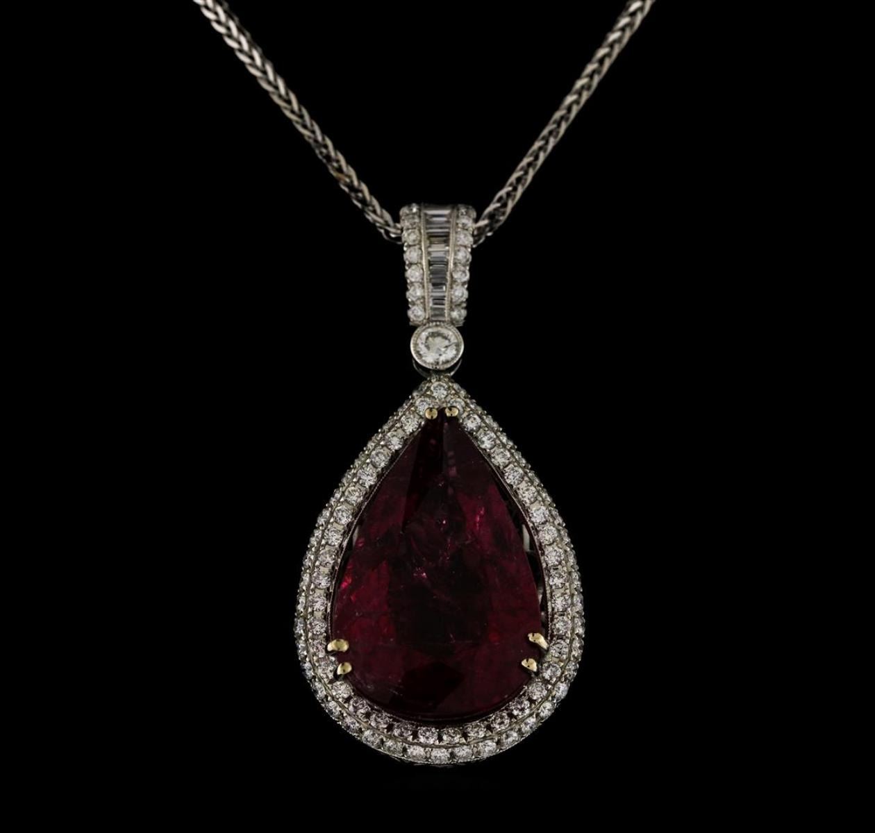 One 18KT White Gold "One of a Kind" Pendant with 18 inches chain included, 17.74 grams. Containing: Main Gemstones: Identity: Natural Tourmaline. Carat Weight: 17.94 cts tw. Shape & Measurement: Pear Shape. Quality: Fine Rubellite Color Tourmaline. Adjacent Gemstones: Identity: Natural Diamonds. Shape: Round brilliant cut and baguette cut. Carat Weight: 1.54 cts tw. Quality: VS-SI Clarity, G-H Color. All fine cutting and proportions. Total gemstones weight: 19.48 cts tw. RBGS Appraised at $30,000.00.