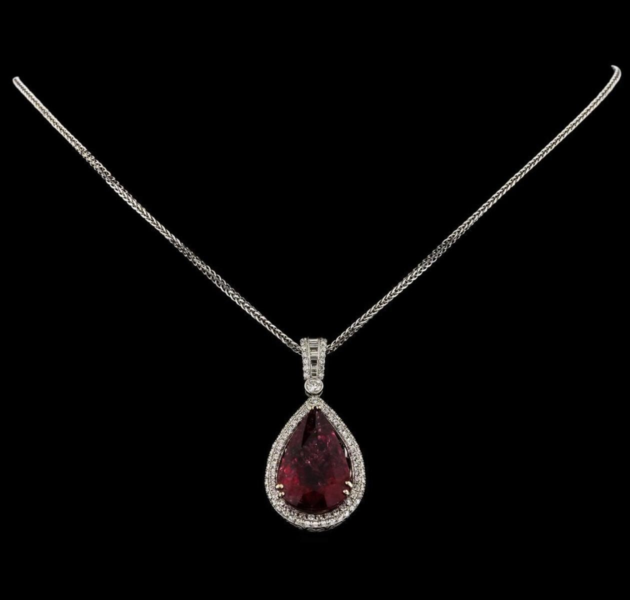 One 18KT White Gold "One of a Kind" Pendant with 18 inches chain included, 17.74 grams. Containing: Main Gemstones: Identity: Natural Tourmaline. Carat Weight: 17.94 cts tw. Shape & Measurement: Pear Shape. Quality: Fine Rubellite Color Tourmaline. Adjacent Gemstones: Identity: Natural Diamonds. Shape: Round brilliant cut and baguette cut. Carat Weight: 1.54 cts tw. Quality: VS-SI Clarity, G-H Color. All fine cutting and proportions. Total gemstones weight: 19.48 cts tw. RBGS Appraised.