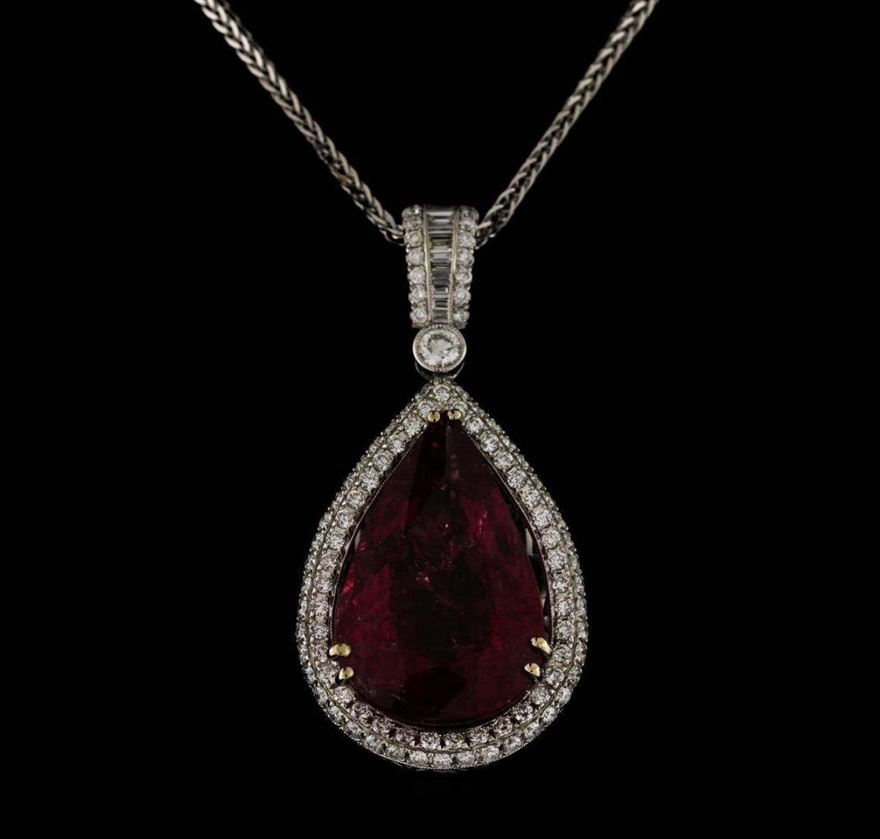 One 18KT White Gold "One of a Kind" Pendant with 18 inches chain included, 17.74 grams. Containing: Main Gemstones: Identity: Natural Tourmaline. Carat Weight: 17.94 cts tw. Shape & Measurement: Pear Shape. Quality: Fine Rubellite Color Tourmaline. Adjacent Gemstones: Identity: Natural Diamonds. Shape: Round brilliant cut and baguette cut. Carat Weight: 1.54 cts tw. Quality: VS-SI Clarity, G-H Color. All fine cutting and proportions. Total gemstones weight: 19.48 cts tw. RBGS Appraised.