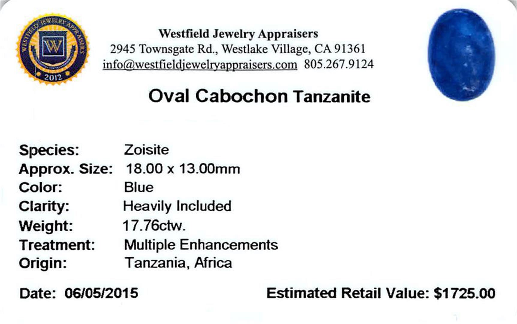 One oval cabochon cut natural tanzanite, measuring 18.00 x 13.00 x 8.00mm, exact weight 17.96ct., clarity is heavily included, type I, dark, very slightly grayish, blue color, (GIA B 7/3), cut is good. Transmitting light somewhat diffusely, transparent to translucent. Naturally occurring internal & external characteristics are present. Indications of heat treatment. Westfield Appraised at $1,725.00.