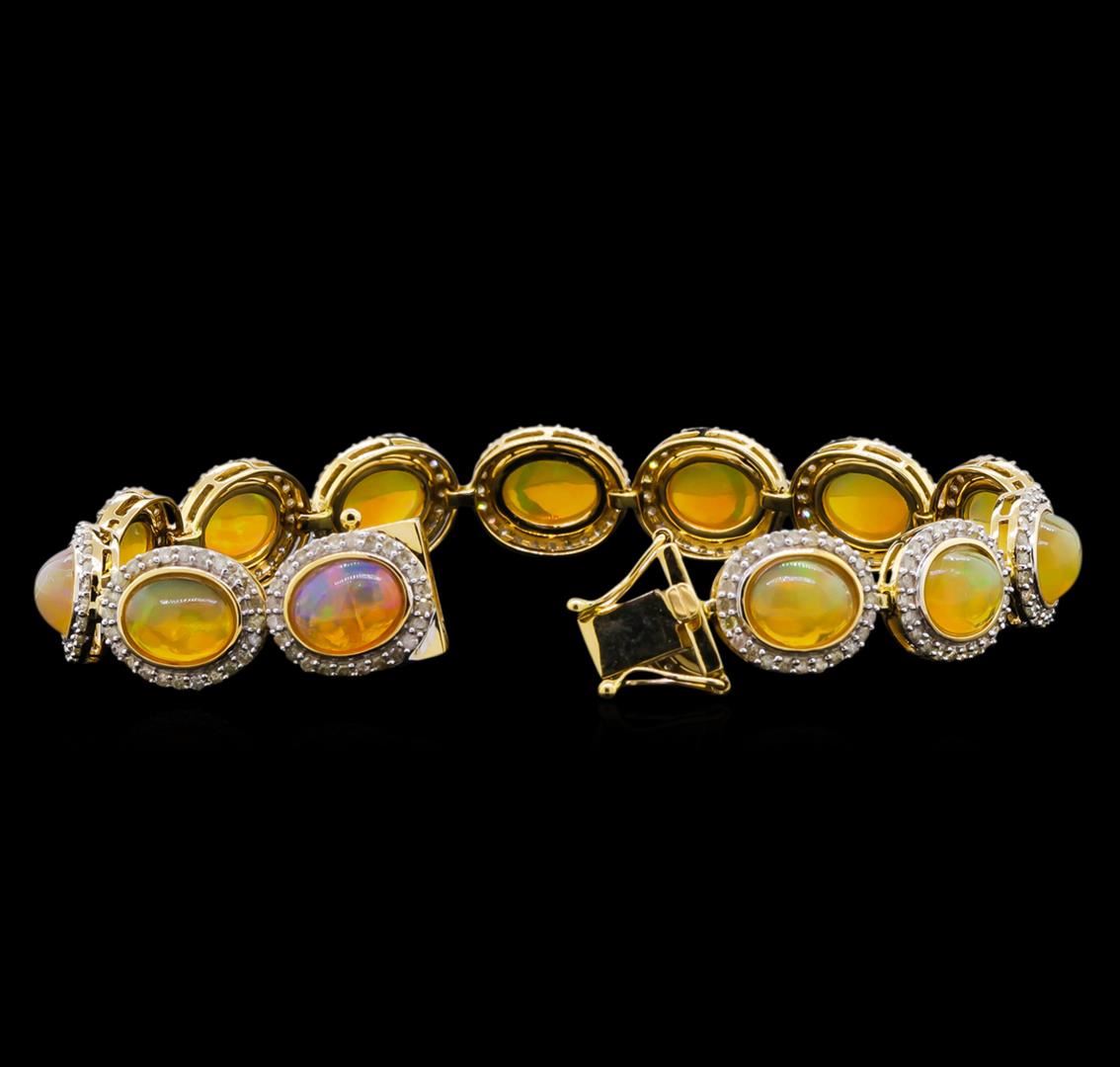 One electronically tested 14KT yellow gold ladies cast & assembled opal and diamond bracelet. Seven and one-quarter inch length bracelet features a flexible opal and diamond bezel ribbon, terminating in a concealed clasp with twin safeties. Bright polish finish with rhodium accents. Trademark is Orianne. Identified with markings of "14K". Condition is new, good workmanship. Containing: Thirteen jelly opals that are cut in a oval shaped cabochon and are bezel set, measuring 9.00 mm long x 7.00 mm wide, and 4.45 mm thick and the approximate weight is 17.96 carats. The opals have a somewhat bright, orange-green play of color (fire) in a flashfire pattern; a high dome; a good cut; slightly included; slight variation in base in their brightness and pattern; and are slightly directional. Measurements are an average for the group. Graded in the setting. Three Hundred Twelve prong set round brilliant cut diamonds approximate total weight of 312 Stones = 3.07ct. Graded in the setting. Clarity: I-2 to I-3. Color: I - K. Total Weight of Diamonds 3.07ct. Total Weight of Opals 17.96ct. Total Weight of Bracelet 21.09gm. AIG Appraised at $13,545.00.