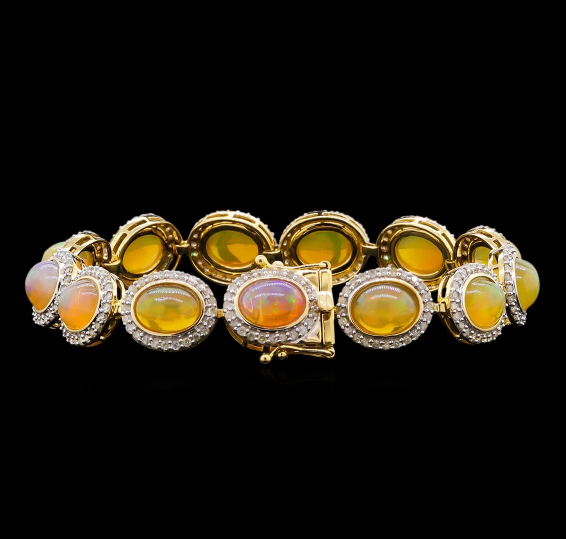 One electronically tested 14KT yellow gold ladies cast & assembled opal and diamond bracelet. Seven and one-quarter inch length bracelet features a flexible opal and diamond bezel ribbon, terminating in a concealed clasp with twin safeties. Bright polish finish with rhodium accents. Trademark is Orianne. Identified with markings of "14K". Condition is new, good workmanship. Containing: Thirteen jelly opals that are cut in a oval shaped cabochon and are bezel set, measuring 9.00 mm long x 7.00 mm wide, and 4.45 mm thick and the approximate weight is 17.96 carats. The opals have a somewhat bright, orange-green play of color (fire) in a flashfire pattern; a high dome; a good cut; slightly included; slight variation in base in their brightness and pattern; and are slightly directional. Measurements are an average for the group. Graded in the setting. Three Hundred Twelve prong set round brilliant cut diamonds approximate total weight of 312 Stones = 3.07ct. Graded in the setting. Clarity: I-2 to I-3. Color: I - K. Total Weight of Diamonds 3.07ct. Total Weight of Opals 17.96ct. Total Weight of Bracelet 21.09gm. AIG Appraised at $13,545.00.