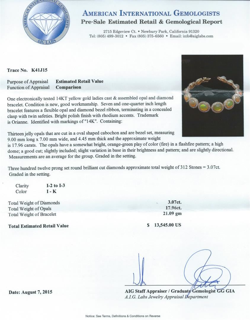 One electronically tested 14KT yellow gold ladies cast & assembled opal and diamond bracelet. Seven and one-quarter inch length bracelet features a flexible opal and diamond bezel ribbon, terminating in a concealed clasp with twin safeties. Bright polish finish with rhodium accents. Trademark is Orianne. Identified with markings of "14K". Condition is new, good workmanship. Containing: Thirteen jelly opals that are cut in a oval shaped cabochon and are bezel set, measuring 9.00 mm long x 7.00 mm wide, and 4.45 mm thick and the approximate weight is 17.96 carats. The opals have a somewhat bright, orange-green play of color (fire) in a flashfire pattern; a high dome; a good cut; slightly included; slight variation in base in their brightness and pattern; and are slightly directional. Measurements are an average for the group. Graded in the setting. Three Hundred Twelve prong set round brilliant cut diamonds approximate total weight of 312 Stones = 3.07ct. Graded in the setting. Clarity: I-2 to I-3. Color: I - K. Total Weight of Diamonds 3.07ct. Total Weight of Opals 17.96ct. Total Weight of Bracelet 21.09gm. AIG Appraised at $13,545.00.