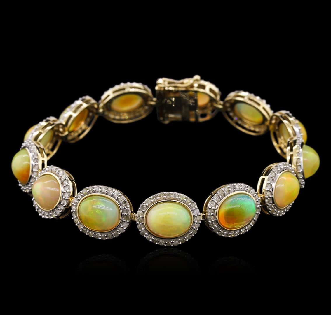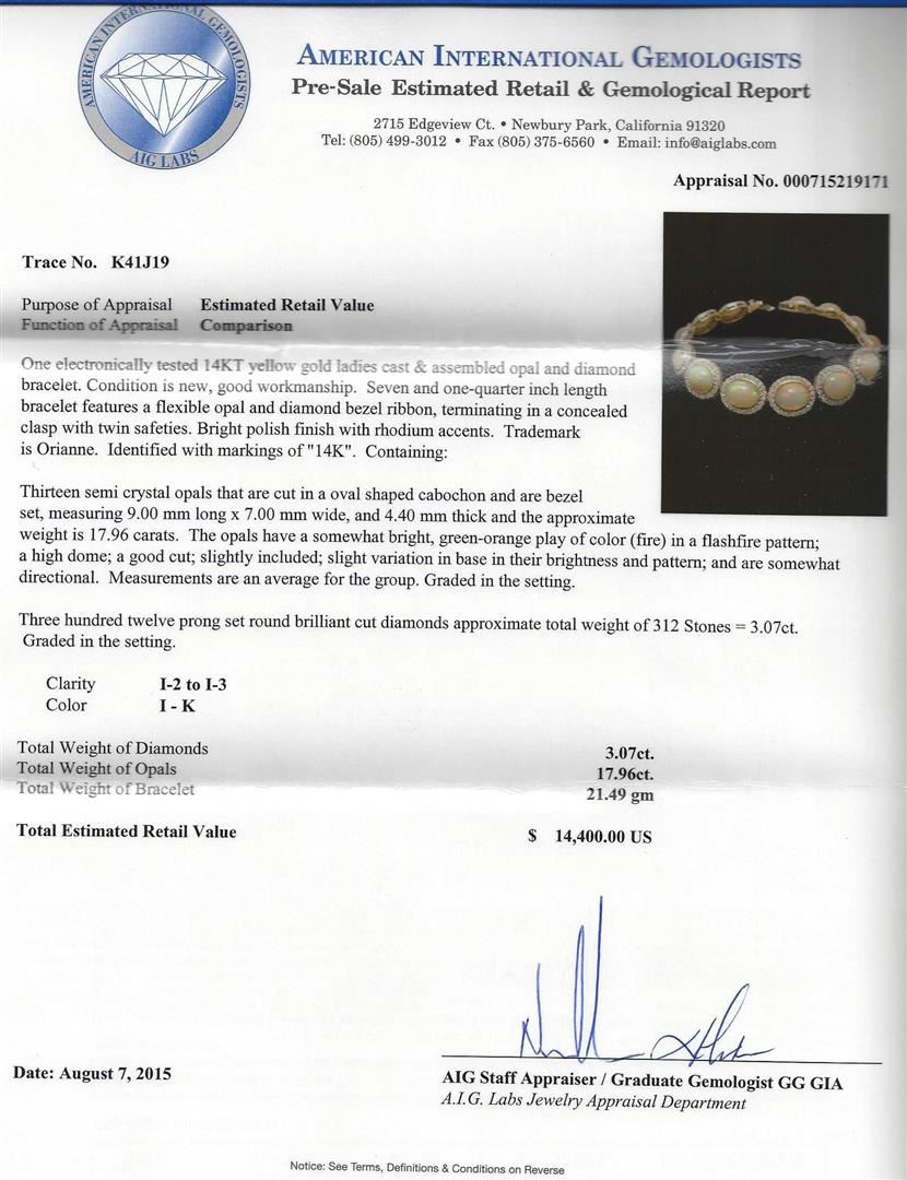 One electronically tested 14KT yellow gold ladies cast & assembled opal and diamond bracelet. Seven and one-quarter inch length bracelet features a flexible opal and diamond bezel ribbon, terminating in a concealed clasp with twin safeties. Bright polish finish with rhodium accents. Trademark is Orianne. Identified with markings of "14K". Condition is new, good workmanship. Containing: Thirteen semi crystal opals that are cut in a oval shaped cabochon and are bezel set, measuring 9.00 mm long x 7.00 mm wide, and 4.40 mm thick and the approximate weight is 17.96 carats. The opals have a somewhat bright, green-orange play of color (fire) in a flashfire pattern; a high dome; a good cut; slightly included; slight variation in base in their brightness and pattern; and are somewhat directional. Measurements are an average for the group. Graded in the setting. Three Hundred Twelve prong set round brilliant cut diamonds approximate total weight of 312 Stones = 3.07ct. Graded in the setting. Clarity: I-2 to I-3. Color: I - K. Total Weight of Diamonds 3.07ct. Total Weight of Opals 17.96ct. Total Weight of Bracelet 21.49gm. AIG Appraised at $14,400.00.