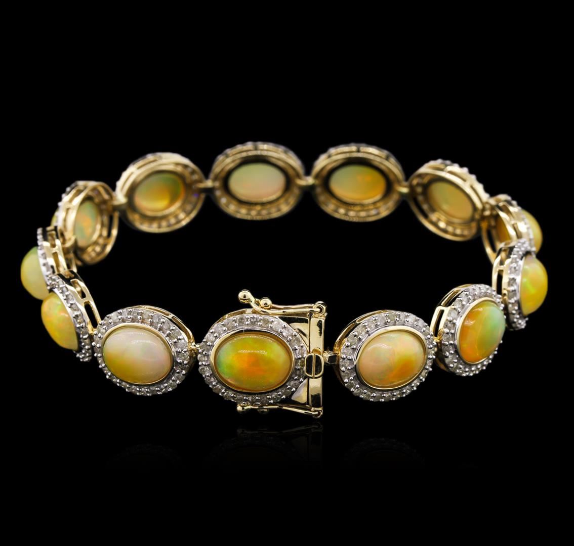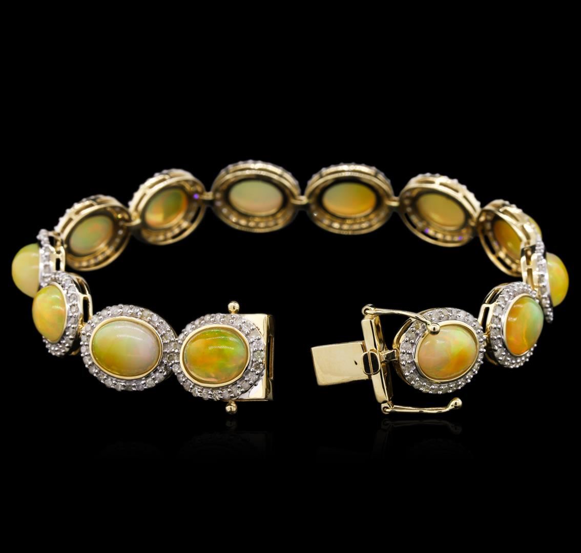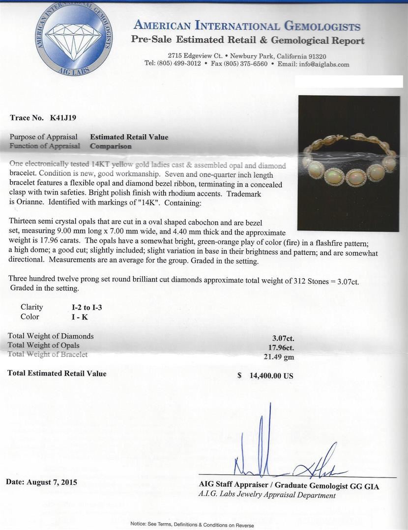 One electronically tested 14KT yellow gold ladies cast & assembled opal and diamond bracelet. Seven and one-quarter inch length bracelet features a flexible opal and diamond bezel ribbon, terminating in a concealed clasp with twin safeties. Bright polish finish with rhodium accents. Trademark is Orianne. Identified with markings of "14K". Condition is new, good workmanship. Containing: Thirteen semi crystal opals that are cut in a oval shaped cabochon and are bezel set, measuring 9.00 mm long x 7.00 mm wide, and 4.40 mm thick and the approximate weight is 17.96 carats. The opals have a somewhat bright, green-orange play of color (fire) in a flashfire pattern; a high dome; a good cut; slightly included; slight variation in base in their brightness and pattern; and are somewhat directional. Measurements are an average for the group. Graded in the setting. Three Hundred Twelve prong set round brilliant cut diamonds approximate total weight of 312 Stones = 3.07ct. Graded in the setting. Clarity: I-2 to I-3. Color: I - K. Total Weight of Diamonds 3.07ct. Total Weight of Opals 17.96ct. Total Weight of Bracelet 21.49gm. AIG Appraised at $14,400.00.