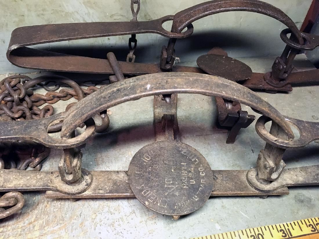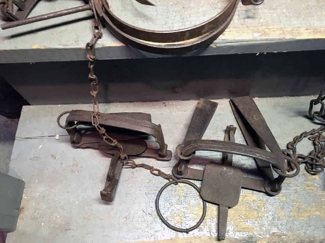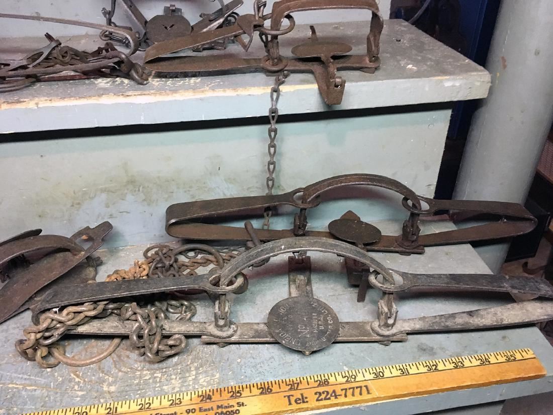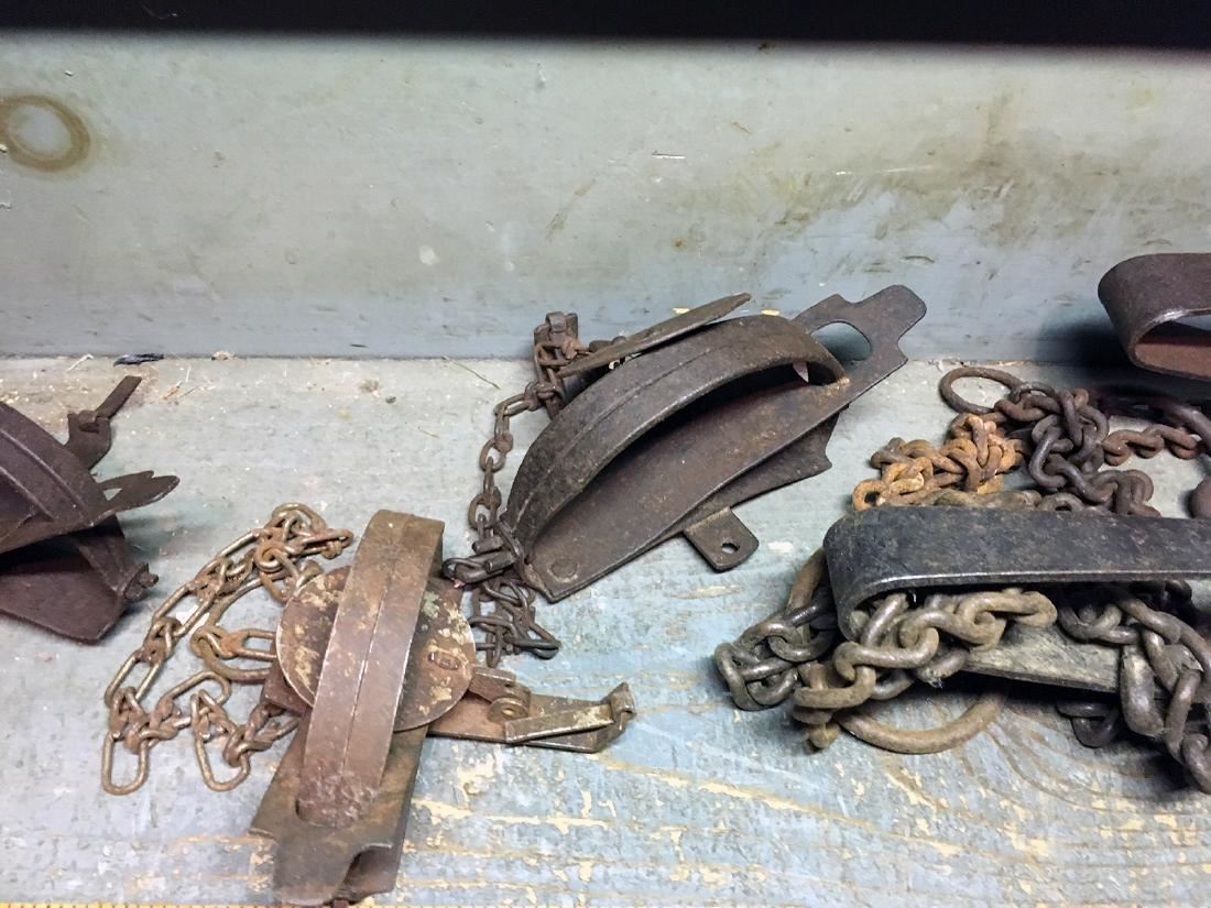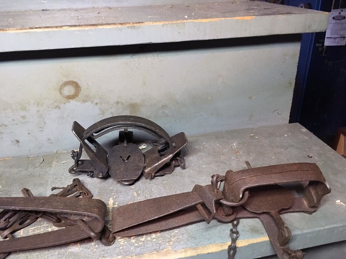 Approx. 17 steel traps including Newhouse No. 8, Blake and Lamb, Victor, including small and medium traps many with chains and hooks. Well cared for and oiled, part of a lifetime collection (RL).