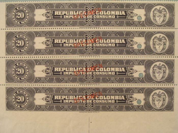 This is a plate block of (17) 20 Centavos tax stamps (in 3 separate sections) from Republic De Colombia, marked "IMPUESTO DE CONSUMO." Each has a red "SPECIMEN" overprint and security punch. They are marked "American Bank Note Co." They have no gum, and are unused, in very good condition.