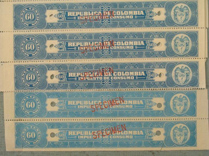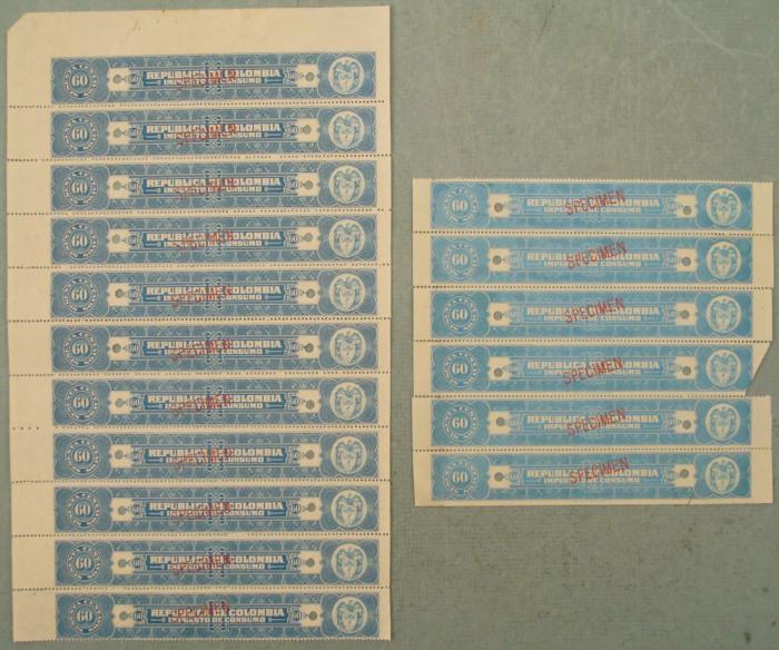 These (17) 60 Centavos plate block tax stamps (in 2 separate sections) are from Republic De Colombia, marked "IMPUESTO DE CONSUMO." There are slight differences between the two--one has lighter printing, making it an interesting variation. Each has a red "SPECIMEN" overprint and security punch. They are marked "American Bank Note Co." They have no gum, and are unused, in very good condition. One has a torn corner, and there is some slight separation at the perforated edges.