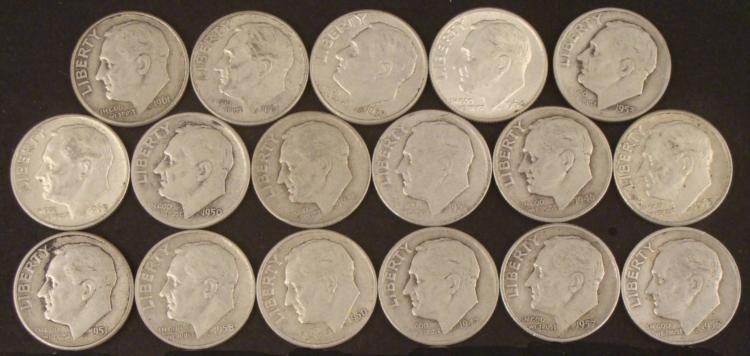 17 Different Date Roosevelt Silver Dimes * Details: Nice set Dates: 1946-P, 1950-D, 1951-P, D, 1952-P, D, 1953-D,1957-P, 1958-D, 1959-D, 1960-D, 1961-D, 1962-D, 1963-P, D, 1964-P, D