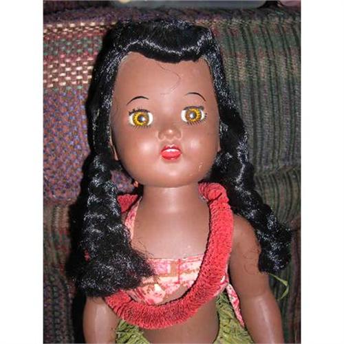 This is a great 17" hard plastic brown tone doll representing Hawaii. She is from the 1950's and you can tell from the pictures that she has not been played with. Her hard plastic is not scratched up. They just don't get any nicer than this one. She has brown sleep eyes and black hair in braids. She has on her original outfit. The only fault is on the inside of her left hand there is a rough spot where it appears when the hard plastic came out of the mold an extra little piece was left. I've included a picture. It's really not distracting and is on the inside of the hand but wanted to mention it. If you are looking for a nice Hawaiian doll from the 1950's, she's it. She is a walker so when her legs move, her head turns. She has an open mouth and teeth. She has no bad smells and comes from a smoke free environment. If you can love her, please bid. Buyer to pay $20 for U.S. shipping, insurance, and handling. Thanks for viewing.