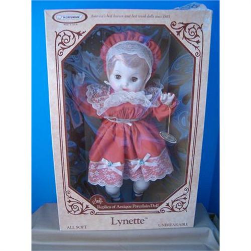 This beautiful Horsman Doll is a soft replica of an antique porcelain doll. Her name is Lynette and she is wearing all original clothing (rose dress & bonnet w/white lace trim). She has brown eyes and blonde hair and they are still netted. She is mint in her box, however the box is slightly shop worn (the right upper corner, which has been taped to prevent further damage. Her cost reflects the less than perfect box... Order three of anything that we can ship in one container, pay with PayPal and shipping is FREE...