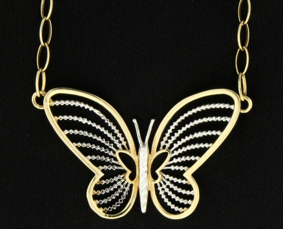 In 14K yellow & white gold this necklace has great detail! The butterfly is 1 1/2 inch wide. 6.0g