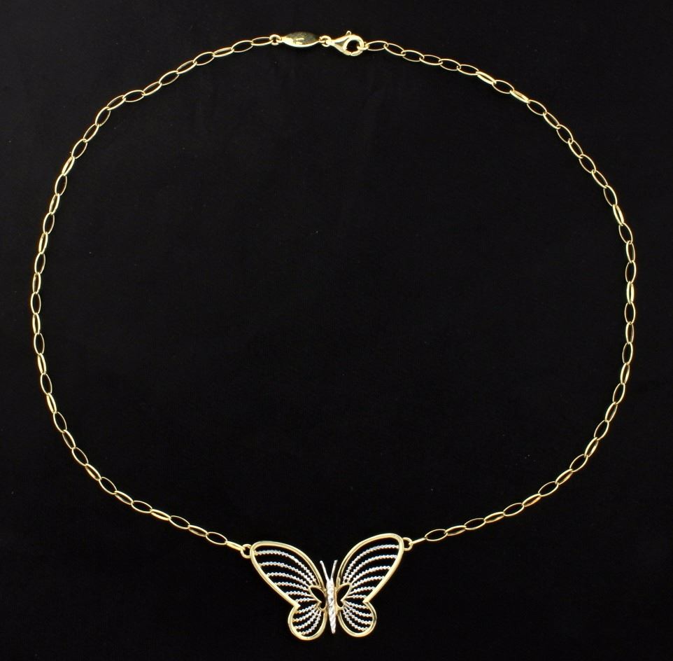In 14K yellow & white gold this necklace has great detail! The butterfly is 1 1/2 inch wide. 6.0g