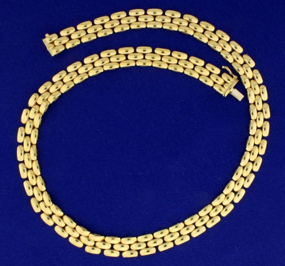 In 18k yellow gold.  Approx. 9.25mm wide, 17 inches long, with safety clasp.  Beautiful condition and very comfortable to wear.    41.8g