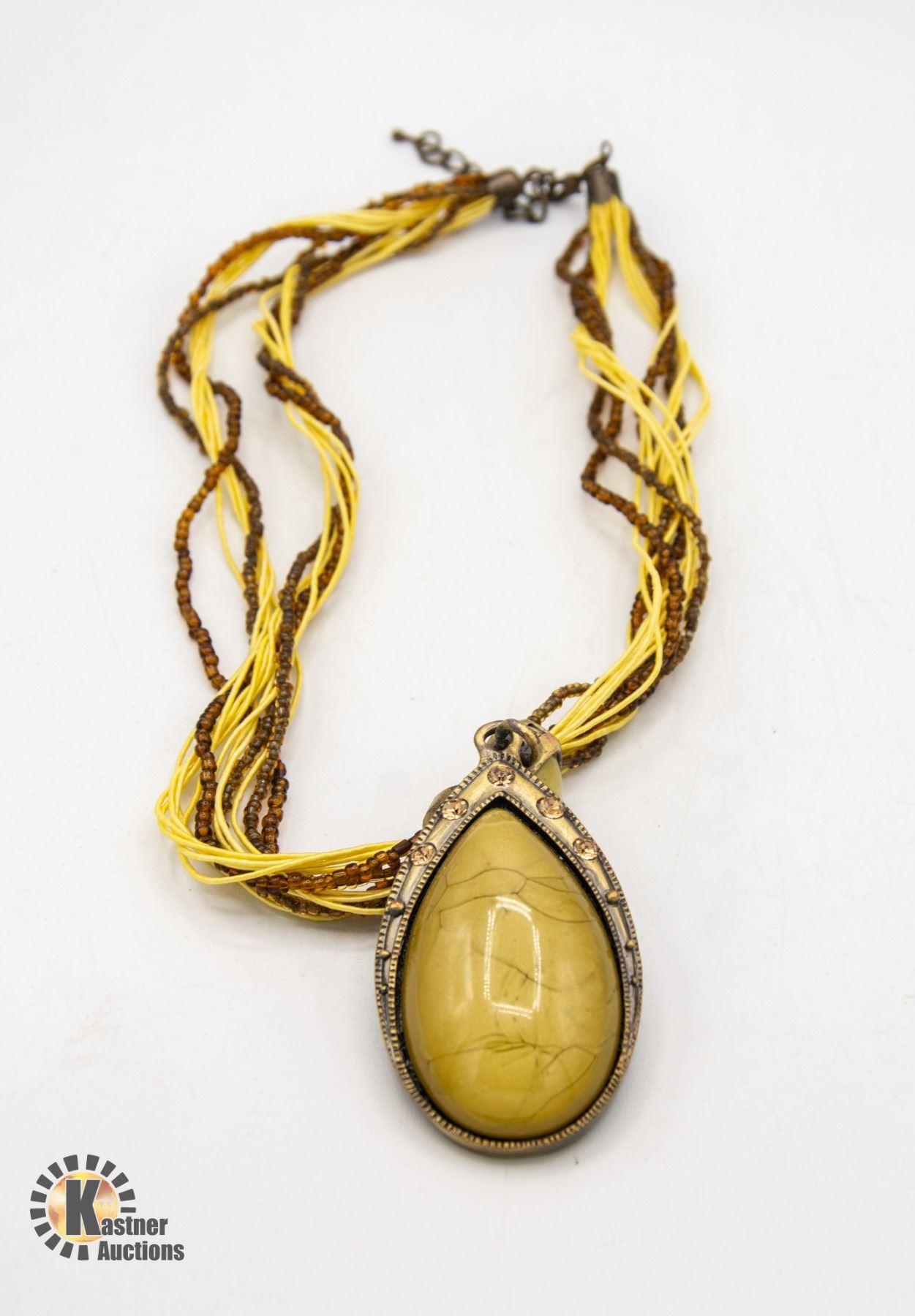 IN AMBER TONE BEADS & PALE OLIVE: FEATURING LARGE GLASS TEARDROP OLIVE GREEN PENDANT IN COPPER TONE SETTING W/ TOPAZ COLOURED RHINESTONES