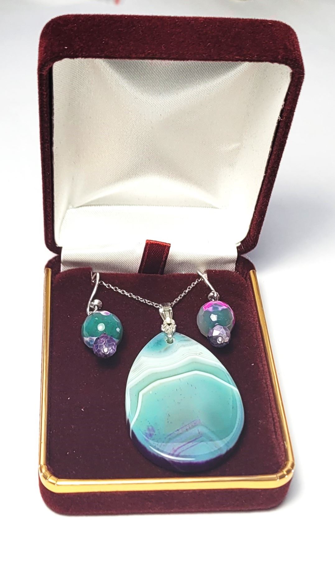 PEACH BLOW ONYX AGATE PENDANT ON 18" CHAIN AND COORDINATING DROP EARRINGS IN VELVET GIFT BOX. JEWELERY