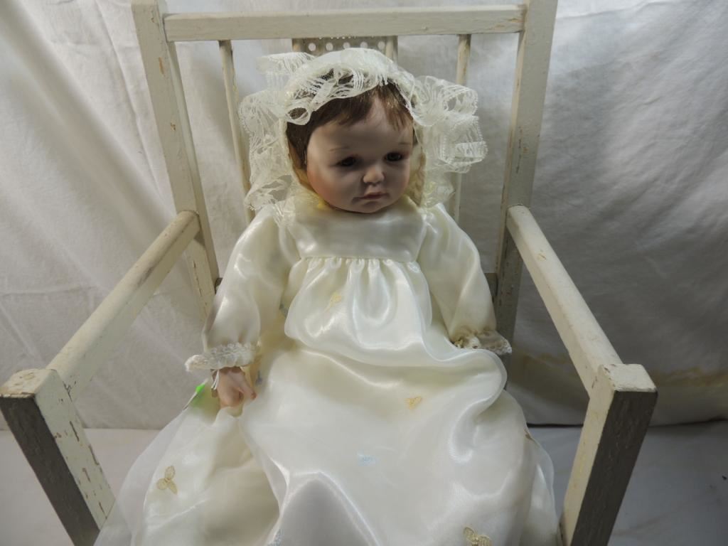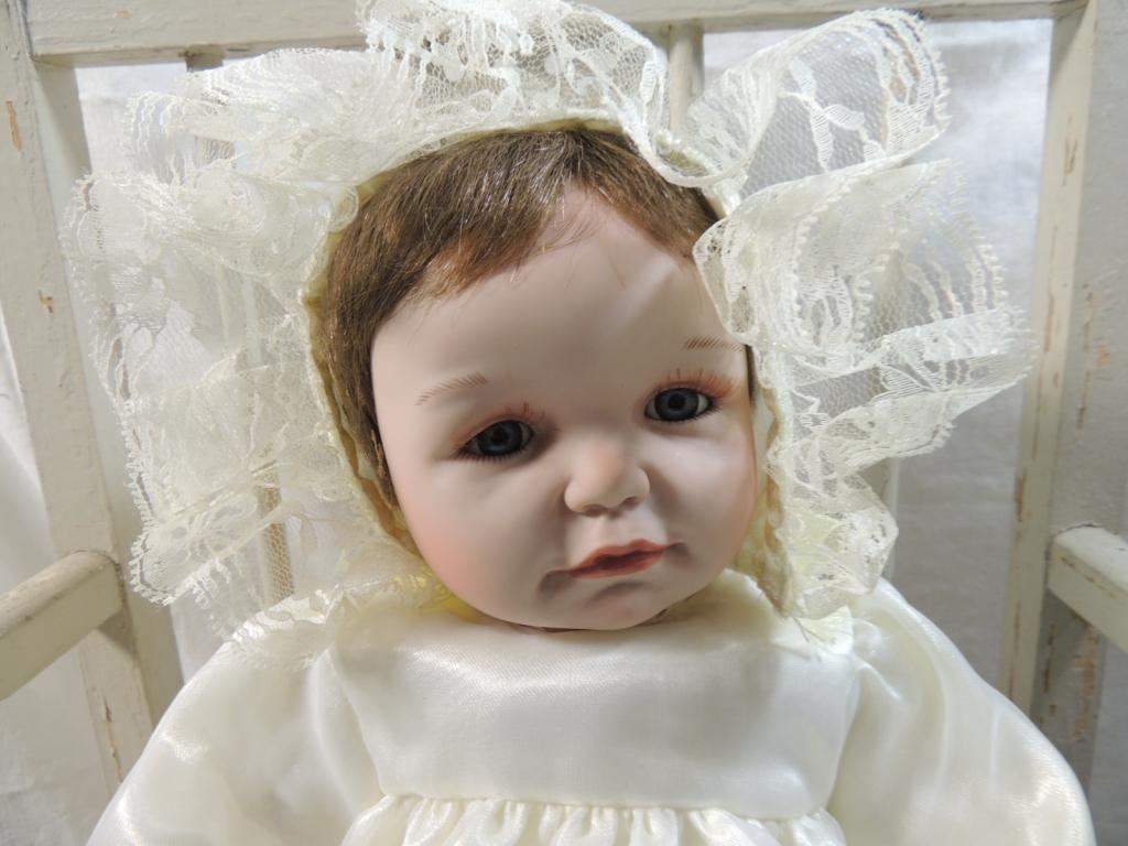 FRANKLIN MINT NUMBERED LIMITED PORCELAIN DOLL CHRISTENING DRESS. SHORT BROWN HAIR BLUE EYES BABY DOLL AS SHOWN ESE PHOTO FOR MORE DETAILS.