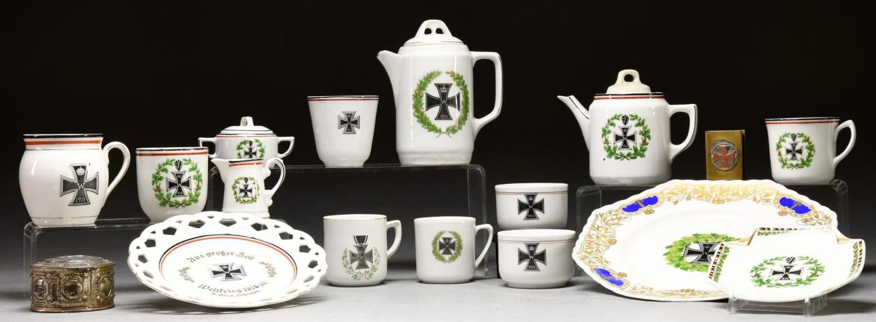 These 17 pieces depict a 1st or 2nd Class Iron Cross. Pieces with a 1st Class Iron Cross include a 3 5/8” flared rim cup, two 2 1/4" teacups, a 2 3/4" demitasse cup, a 3/8” coffee cup, a 6 1/2" coffee or hot water pot, a 7 1/2" plate with reticulated edge that reads “Aus grosser Zeit Weltkrieg 1914-15 A. Glud, Oehringen, and a 10” serving plate by KPM. Pieces with a 2nd Class Iron Cross include a 5” teapot, a 2 3/4" flared rim coffee cup, a 3” teacup, a 3” coffee cup, a miniature 2 1/4" sugar bowl with lid, a miniature 2 1/2" creamer that matches the previous sugar bowl, a 5 3/8” square nut tray, a silver-plated metal box measuring 3 1/4" in diameter, featuring an Iron Cross on the lid, and a 2 1/4" x 1 1/2" match safe with an Iron Cross motif. CONDITION: items do show some wear but no chips were noted. PROVENANCE: From the Lifelong Collection of Glen E. Mattox. (02-18724-1/BF). $600-900.