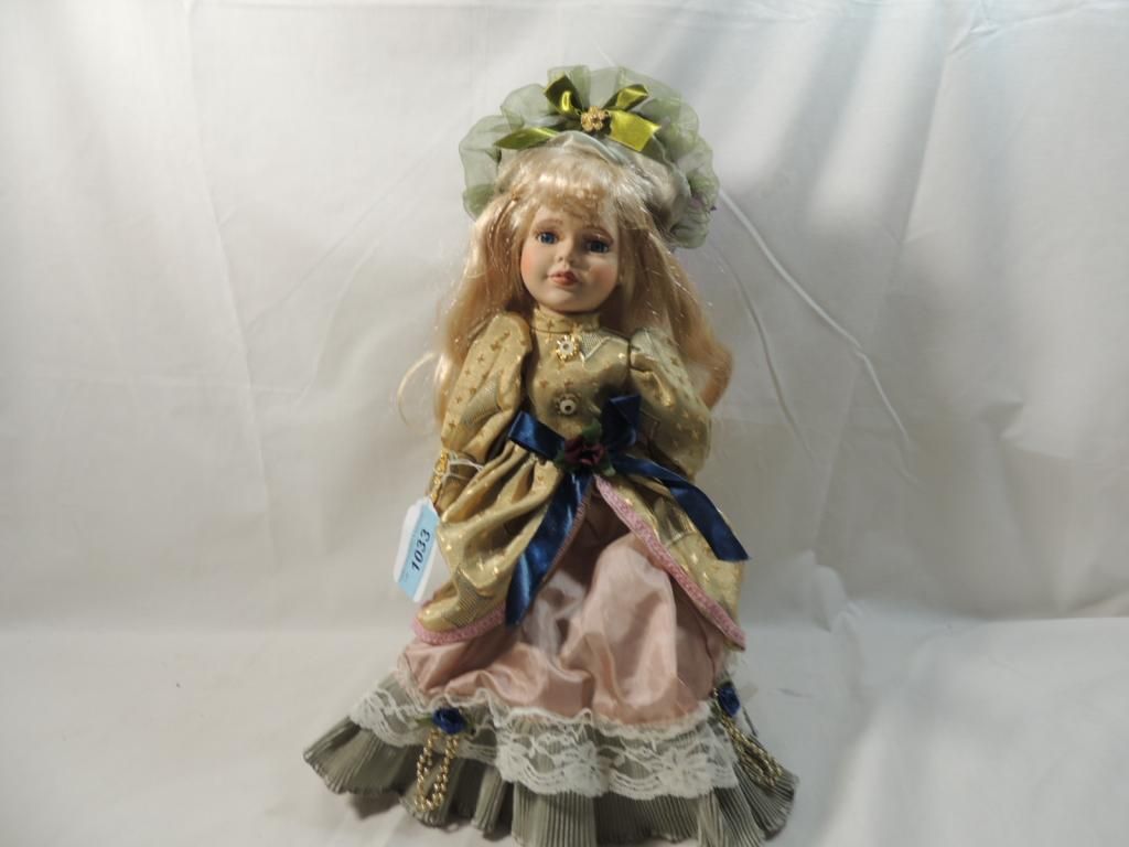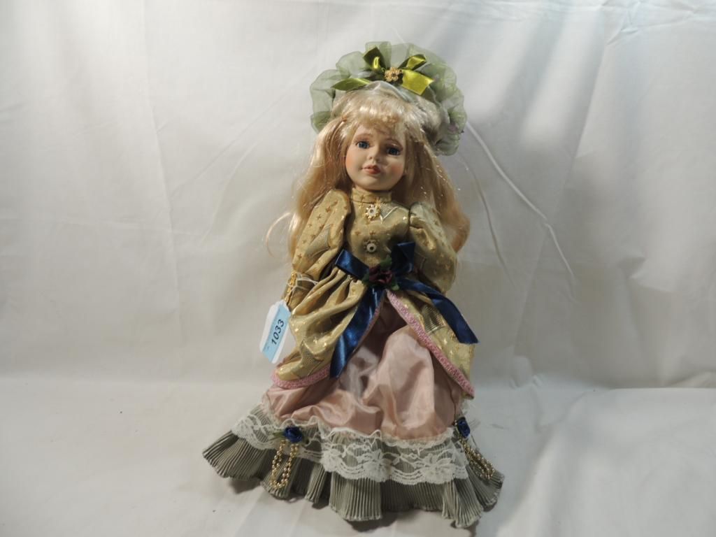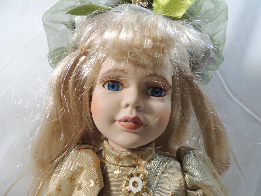 LONG BLONDE HAIR ELEGANT DRESS AND MATCHING HAT WITH FEATHERS BLUE EYES. AS SHOWN. SEE PHOTO FOR MORE DETAILS.