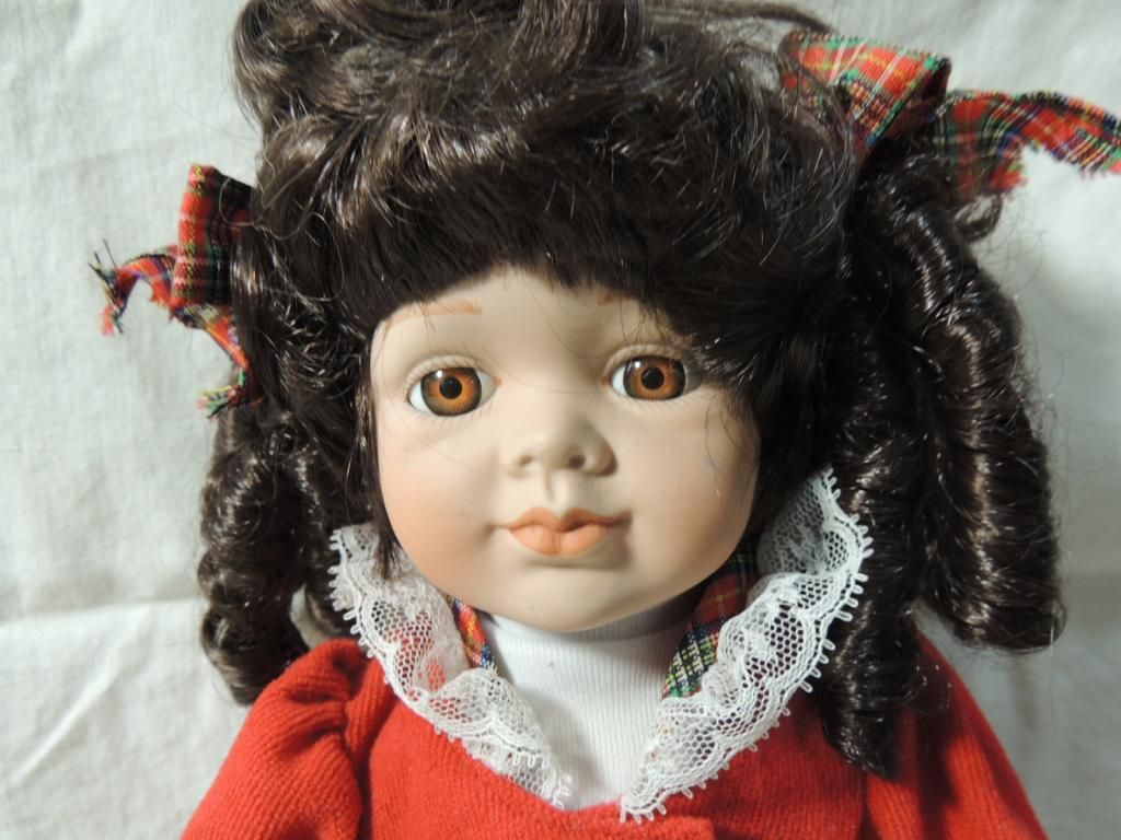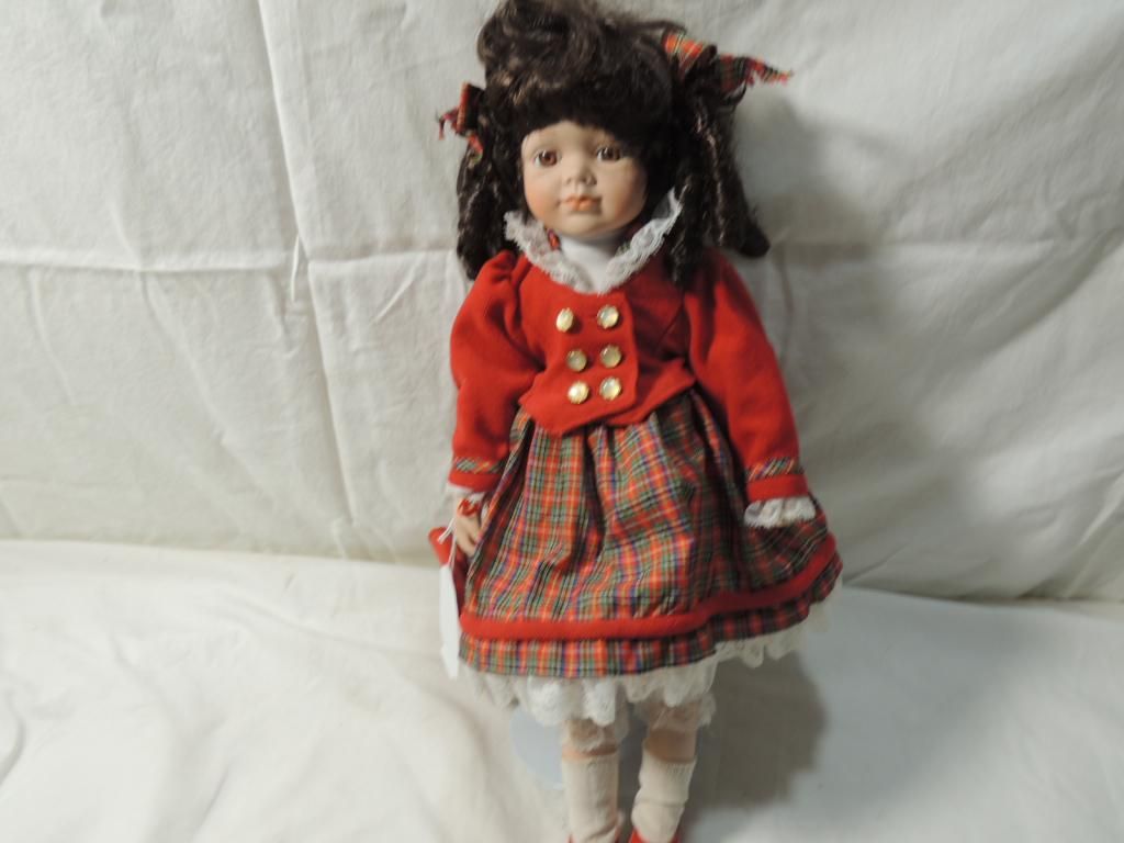 RED JACKET AND PLAID DRESS. BROWN HAIR IN ADORABLE PIGTAILS WITH RINGLET CURLS. WITH MATCHING BAG. AS SHOWN. SEE PHOTO FOR MORE DETAILS.