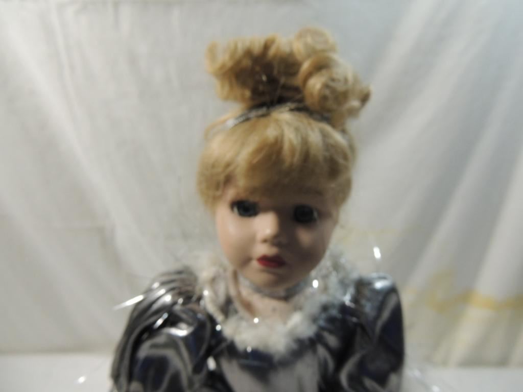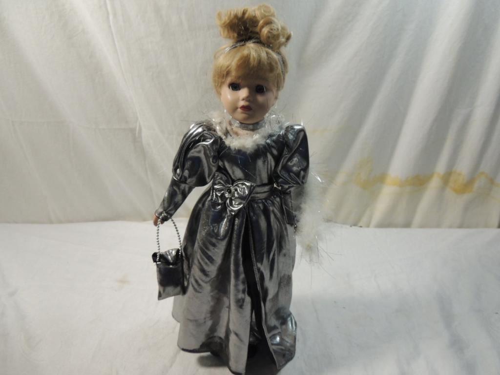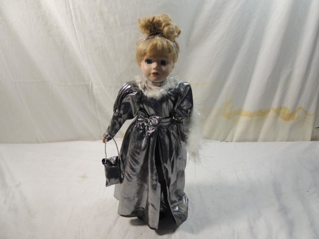 READY FOR AN EVENING OUT BEAUTIFUL DOLL WITH SILVER DRESS. MODERN DOLL WITH MATCHING PURSE BLONDE HAIR LIGHT BLUE GRAY EYES AS SHOWN SEE PHOTO FOR MORE DETAILS
