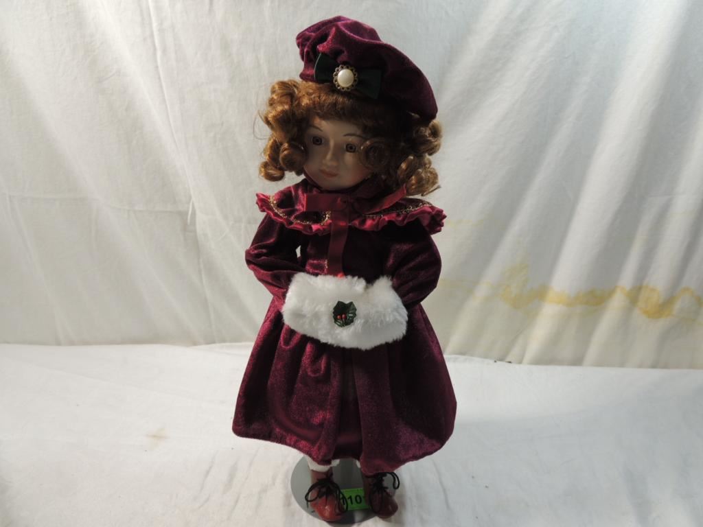 WINTER HOLIDAY DOLL, VELVET DRESS WITH MATCHING HAT AND FAUX FUR MUFF, BOOTS, BROWN HAIR AND BROWN EYES, DECORATIVE COLLECTIBLE WITH STAND, AS SHOWN SEE PHOTO FOR MORE DETAILS.