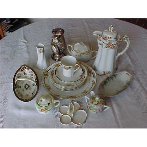 17 Pc. Nippon Group, (c)1900's; 9 Pc. Luncheon set, 1 Chocolate Pot with cover,(9.5" tall), (5) 6" Lunch plates, 1 (9.5" ) 1 Sandwich plate with handles; 1- 5"; Rose Vase; 1 Sugar Bowl with 2 handles; 1 Relish or Pickle Boat dish; 1 Candy Ctr. handle Dish,k 4.5 X 8.5"; 2 jam jars; 1 with Ladle; 1 Hat Pin Holder; 1 -4 Section mint tray with Ctr. handle , 4.5 X 3.75 " tall (very unusual.