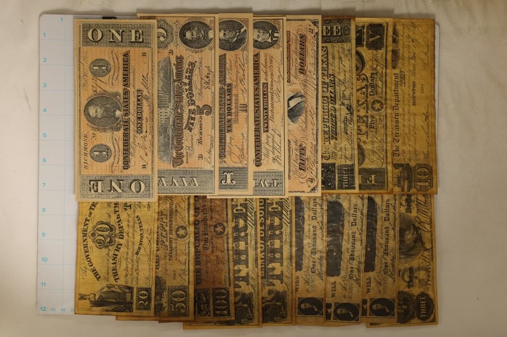 CONFEDERATE STATES OF AMERICA (1, 5, 10, 20 & 50 DOLLARS), 1830'S - 1840'S THE REPUBLIC OF TEXAS )3, 5, 10, 20, 50 & 100 DOLLARS), 2 BANK OF DE SOTO $3 ADVERTISING PIECES, 3-1862 BANK OF NORTH AMERICA $1000 ADVERTISING